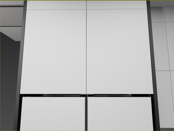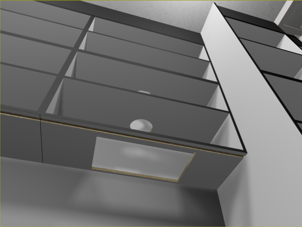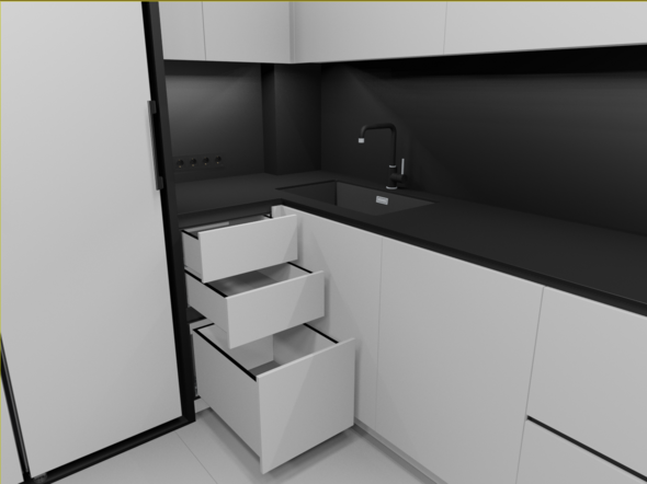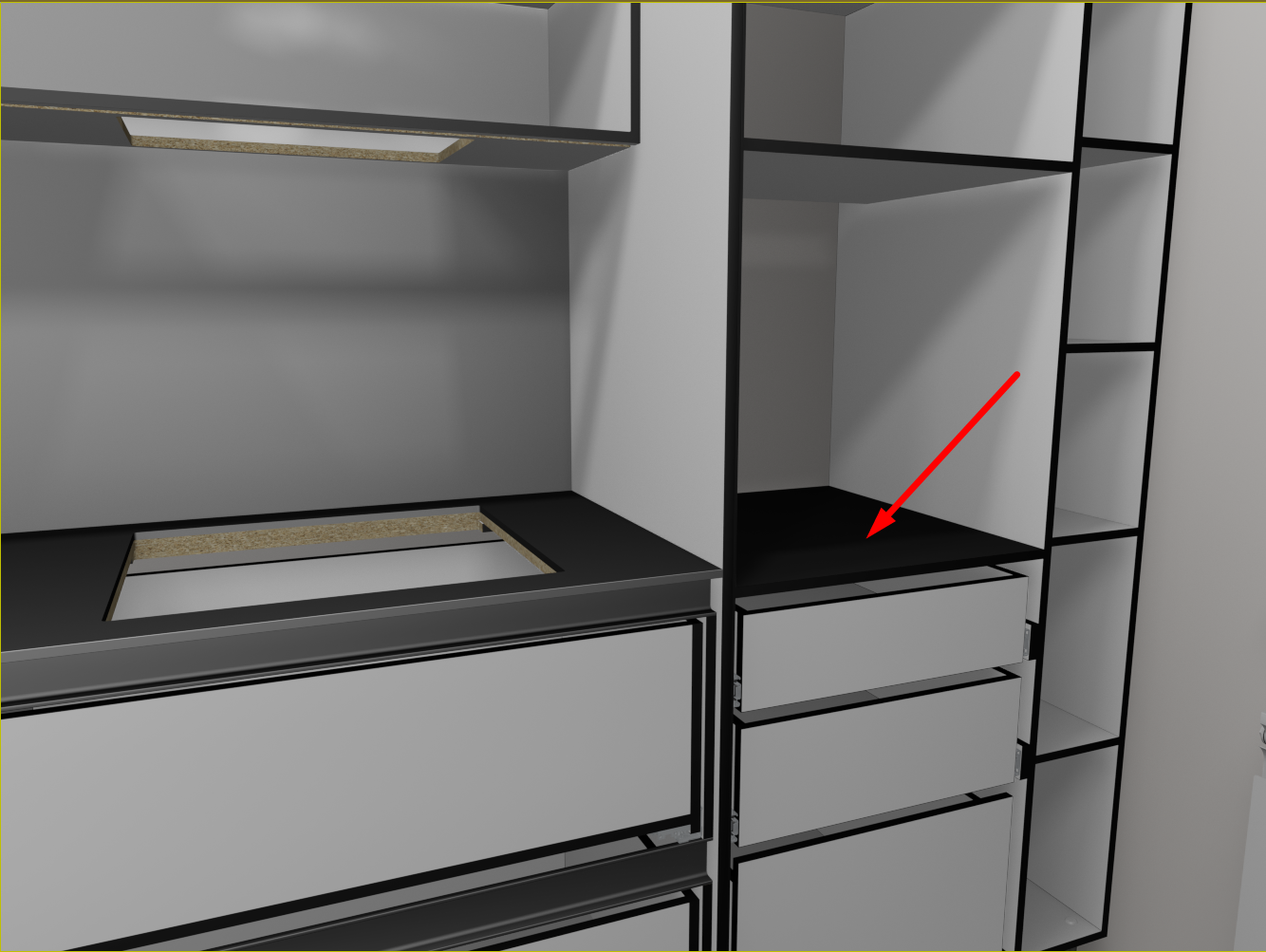 1)  Доработал шкаф R. Лицевые панели изменились, в первом варианте я делал стык ЛДСП, условно не видимым, без кромки и прятал его за нижнею базу,  но, упустил, что таких у меня три, и если на двух я могу спрятать, то на одной нет. Поэтому шов ушёл наверх и по классике стал выделен, само собой потянув за собой высотные отметки. Добавились полки с выдвижными ящиками. Выглядит это так...