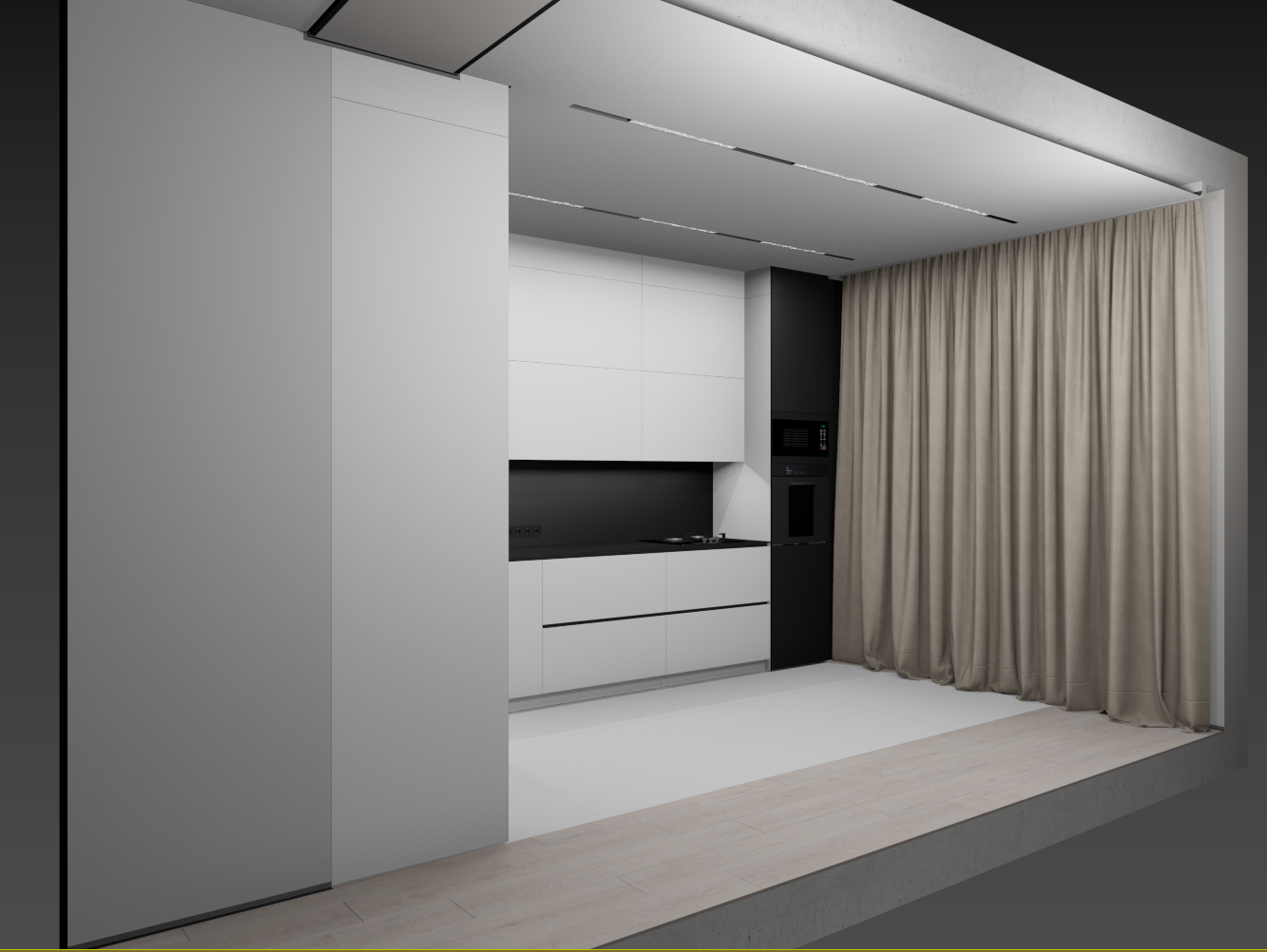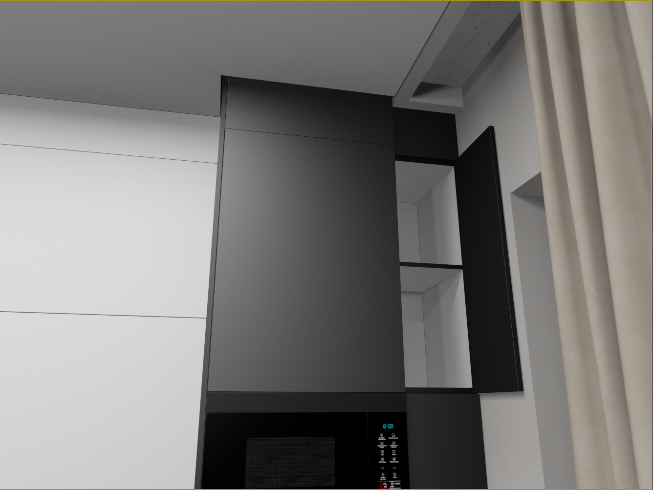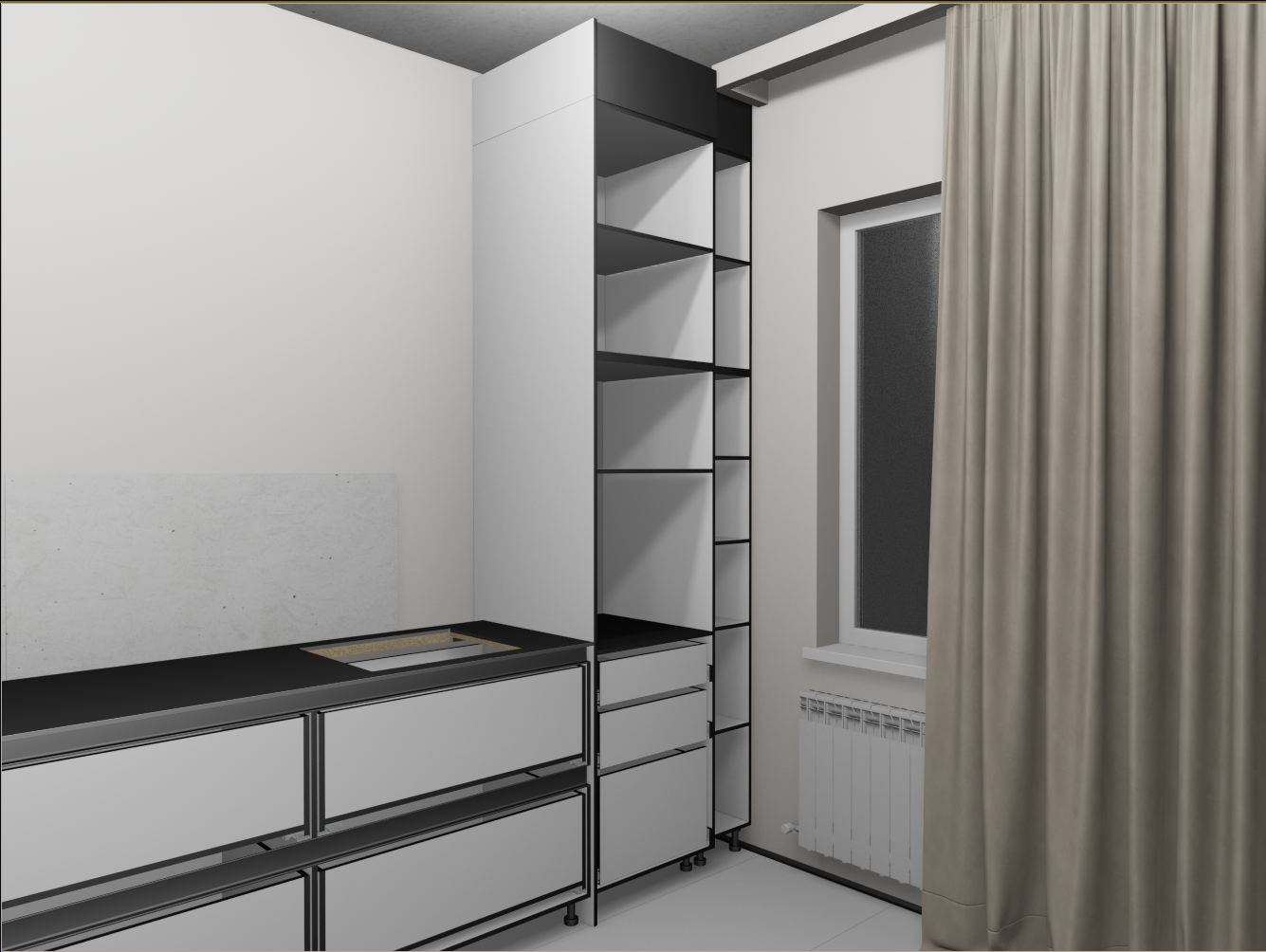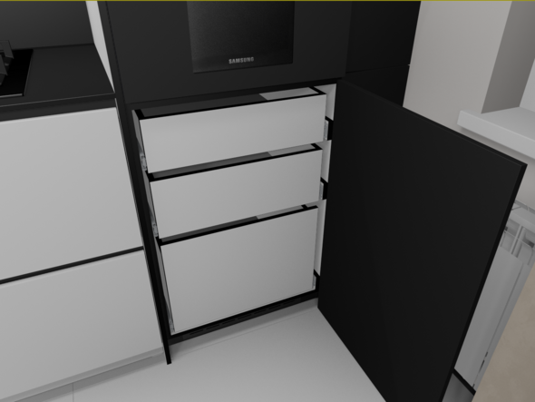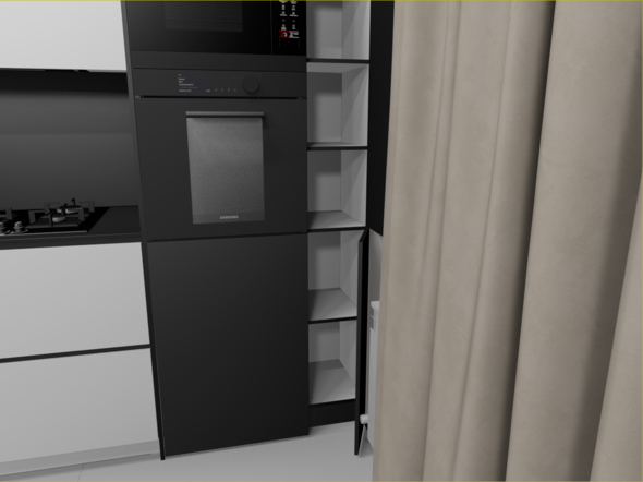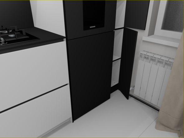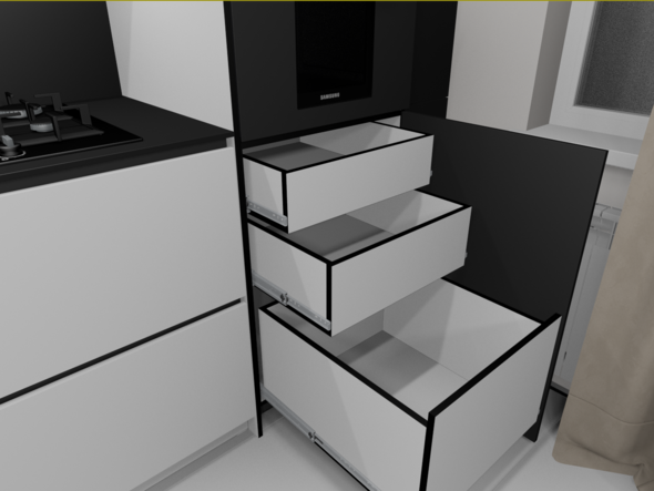 Не, не будет. самые правые узкие модули, вообще не должны были быть, по ТЗ, просто фальш фасад на 150, но с шторами всё равно не дружит, по этому увеличил ширину что бы дыру в потолке закрыть и по глубине общей кухню увеличить, а фасад будет распашной. Внутри просто полки, для длительного хранения. Нижний не будет открываться на 100% но достаточно. Глубина тоже уменьшена, из за  того что он узкий. В свету 248 мм всего.