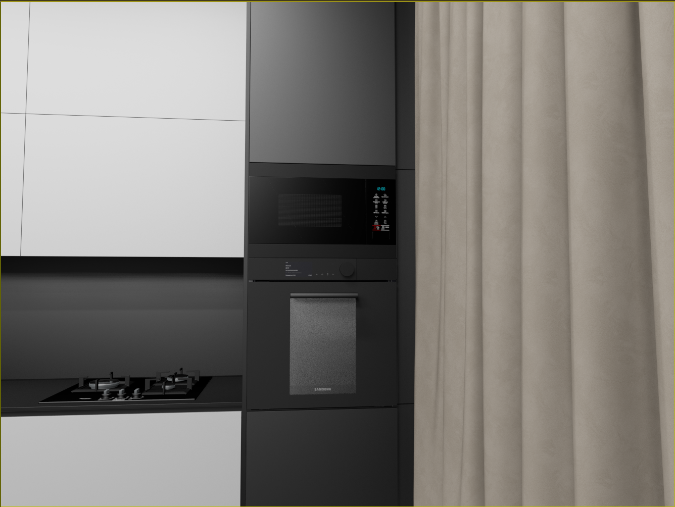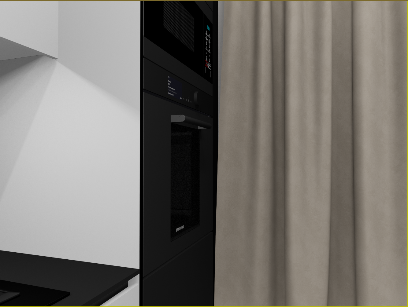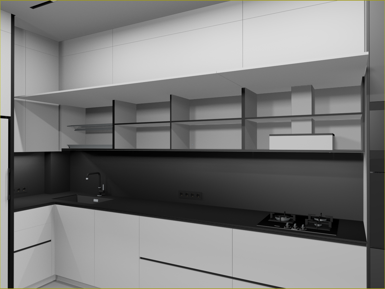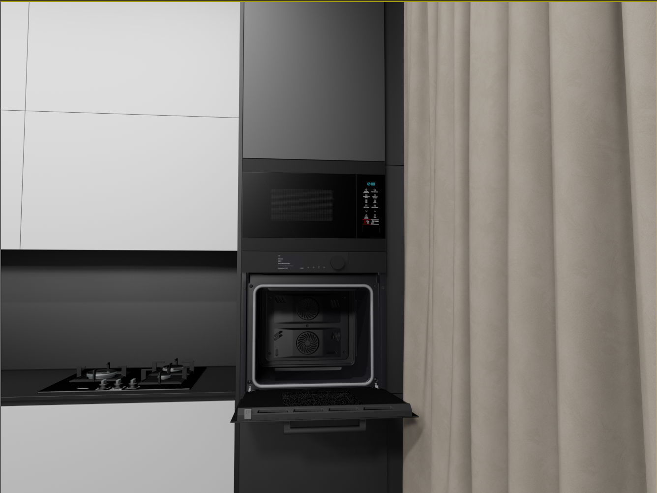 Не, не будет. самые правые узкие модули, вообще не должны были быть, по ТЗ, просто фальш фасад на 150, но с шторами всё равно не дружит, по этому увеличил ширину что бы дыру в потолке закрыть и по глубине общей кухню увеличить, а фасад будет распашной. Внутри просто полки, для длительного хранения. Нижний не будет открываться на 100% но достаточно. Глубина тоже уменьшена, из за  того что он узкий. В свету 248 мм всего.