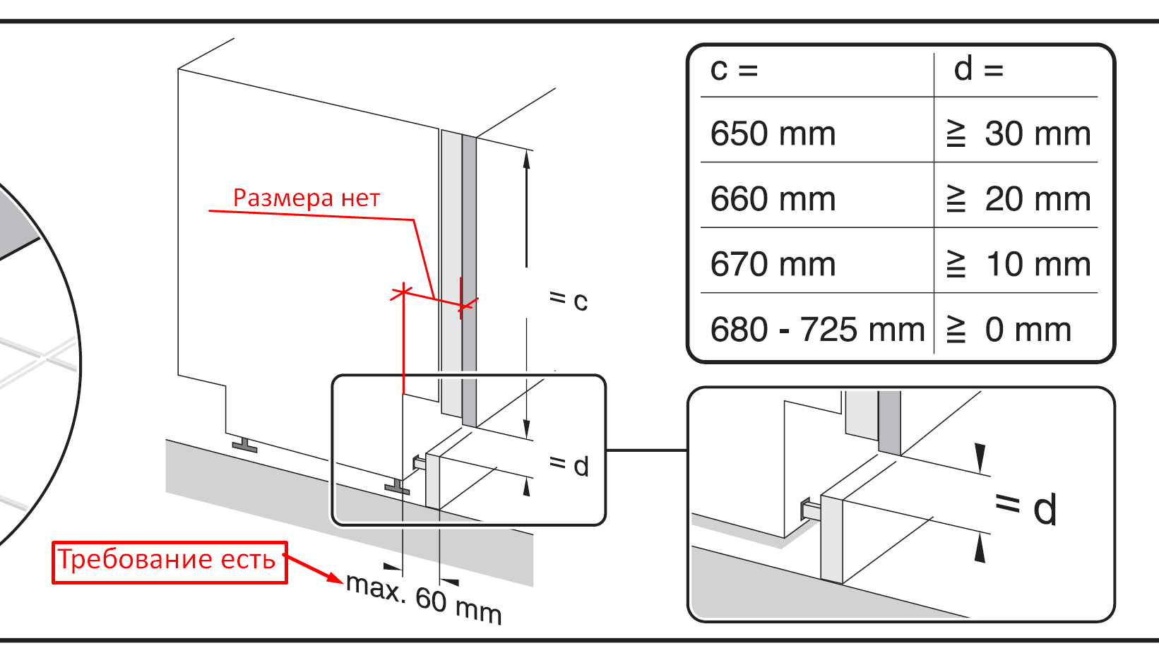 1) У меня получилось добраться посудомоечной машины, второй раз сталкиваюсь с этим, в прошлый раз с поддержкой BOSCH общался, прислали информацию, в этот раз в живую быстрее получилось посмотреть. Загвоздка вот в чем, в инструкции у них есть требование, а вот размер не нашёл я, ни в прошлый раз ни в этот. Вот о этом речь...