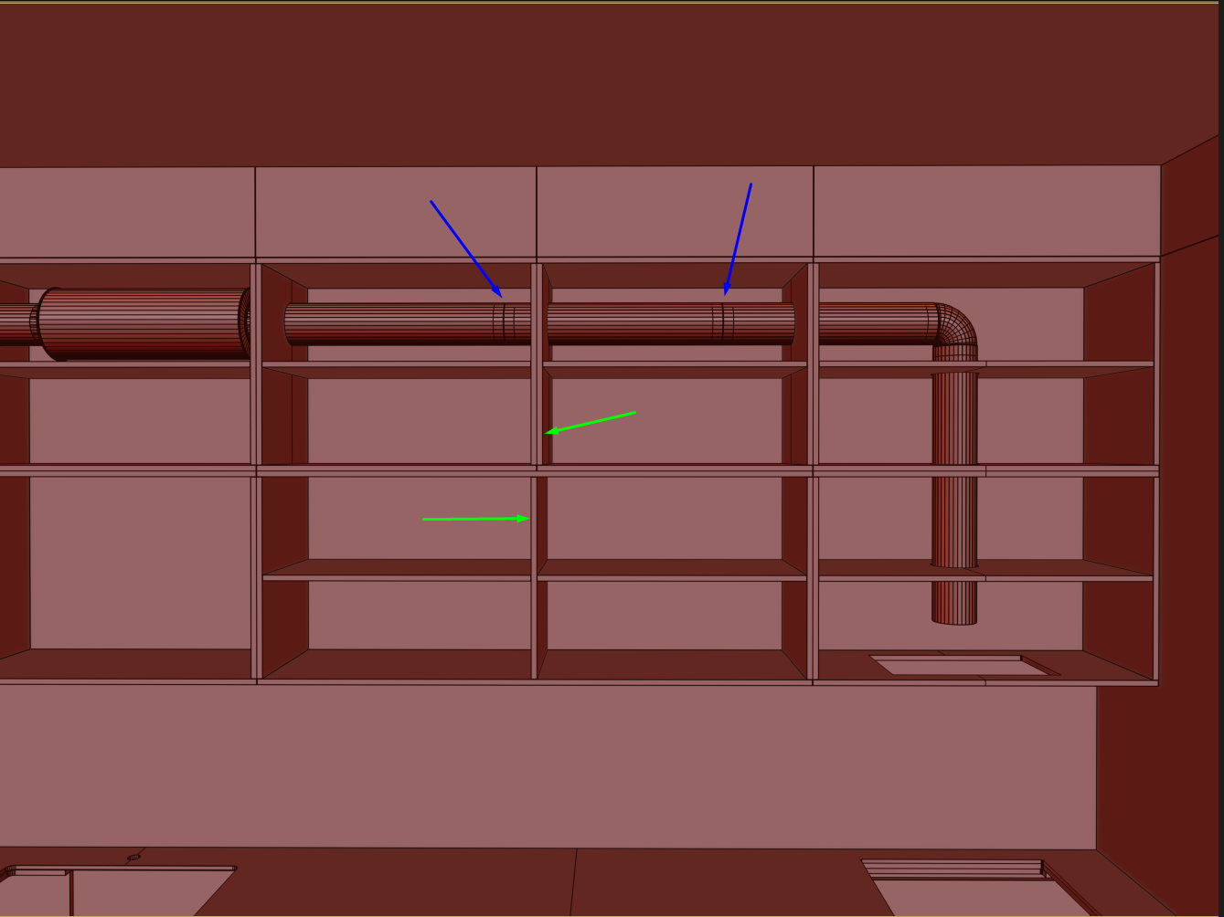 Прядок сборки проверил, всё вроде проходит, потому что вентиляцию будет монтировать другой подрядчик, мебельщики только подготовку сделают, получилось всего два соединения, боялся что будет больше, отметил синим. А вот зелёным отметил что снизу один модуль, а сверху два, это уже забота о монтажниках, не оценят конечно, но сделано. Нижние не могу сильно дробить, потому что без накладки будет выполнено, и сверху пожалуйста, чуток облегчу.
