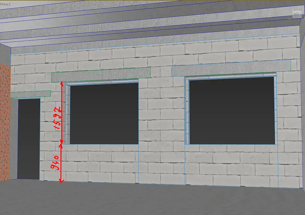 4) Так как на нужные вопросы, есть ответы, сел править. Начал с окон, первое это высота проемов, если они с фронта изменились, то конечно и с бэга должны поменять высоту. Но с фронта они в пол, а вот с бэга они имеют подоконник. И нужно принять решение по нему, потому что если просто сместить перемычку вниз это будет отвратно. Да и высота подоконника меня смущала, с самого начала я её сделал по блокам, не знаю как кому, а я не люблю такие высокие подоконники.