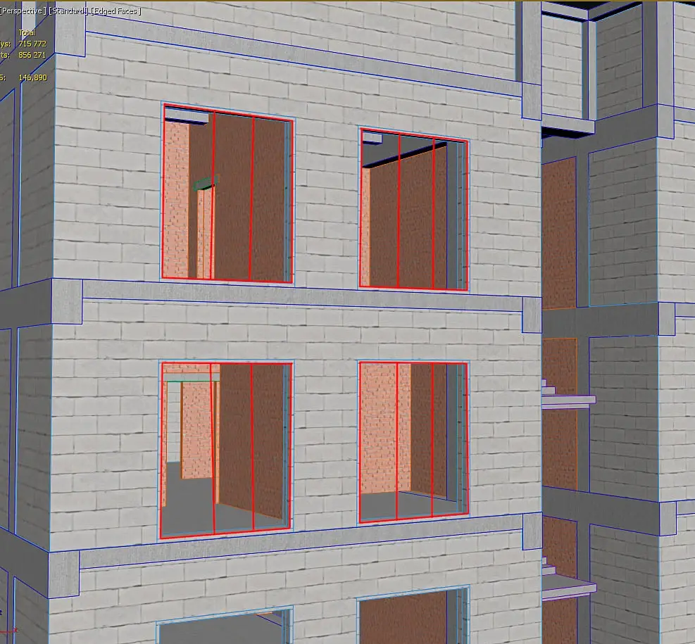 4) Так как на нужные вопросы, есть ответы, сел править. Начал с окон, первое это высота проемов, если они с фронта изменились, то конечно и с бэга должны поменять высоту. Но с фронта они в пол, а вот с бэга они имеют подоконник. И нужно принять решение по нему, потому что если просто сместить перемычку вниз это будет отвратно. Да и высота подоконника меня смущала, с самого начала я её сделал по блокам, не знаю как кому, а я не люблю такие высокие подоконники.