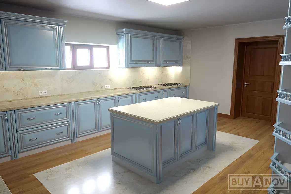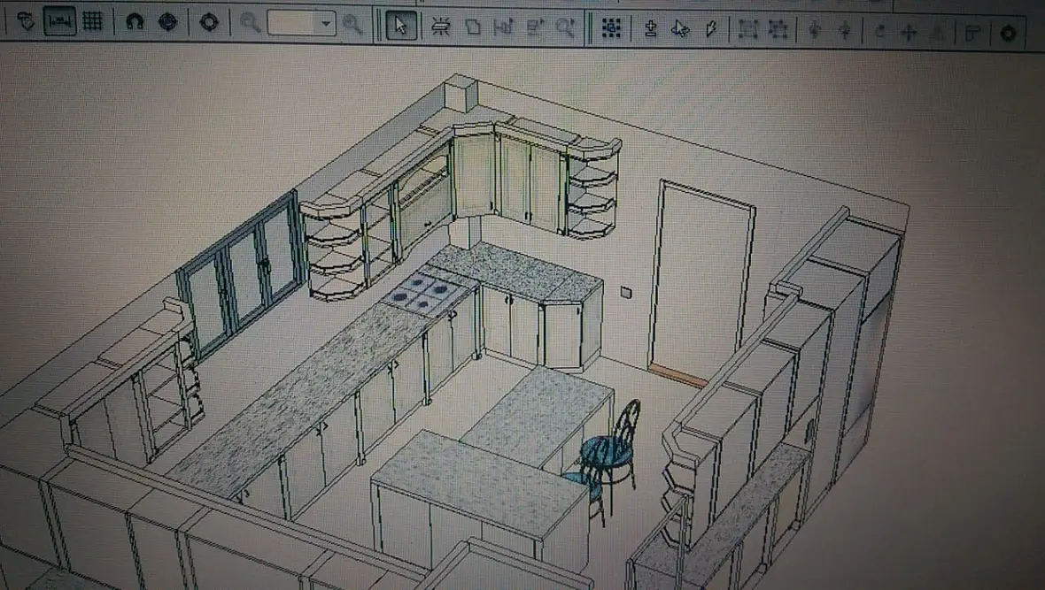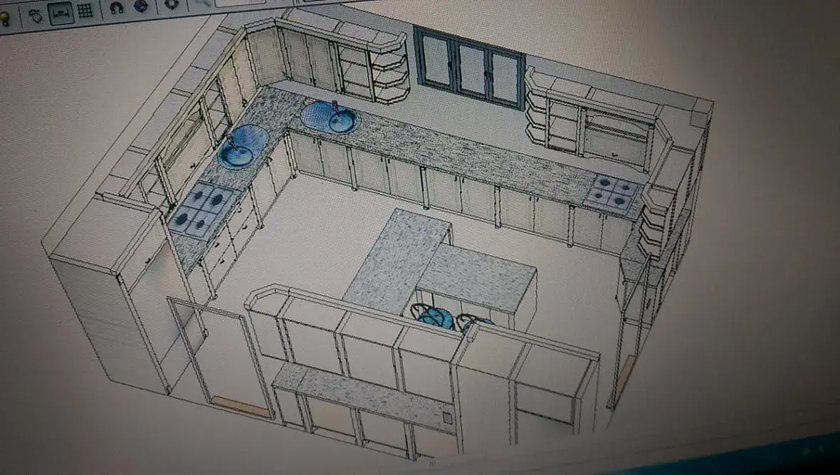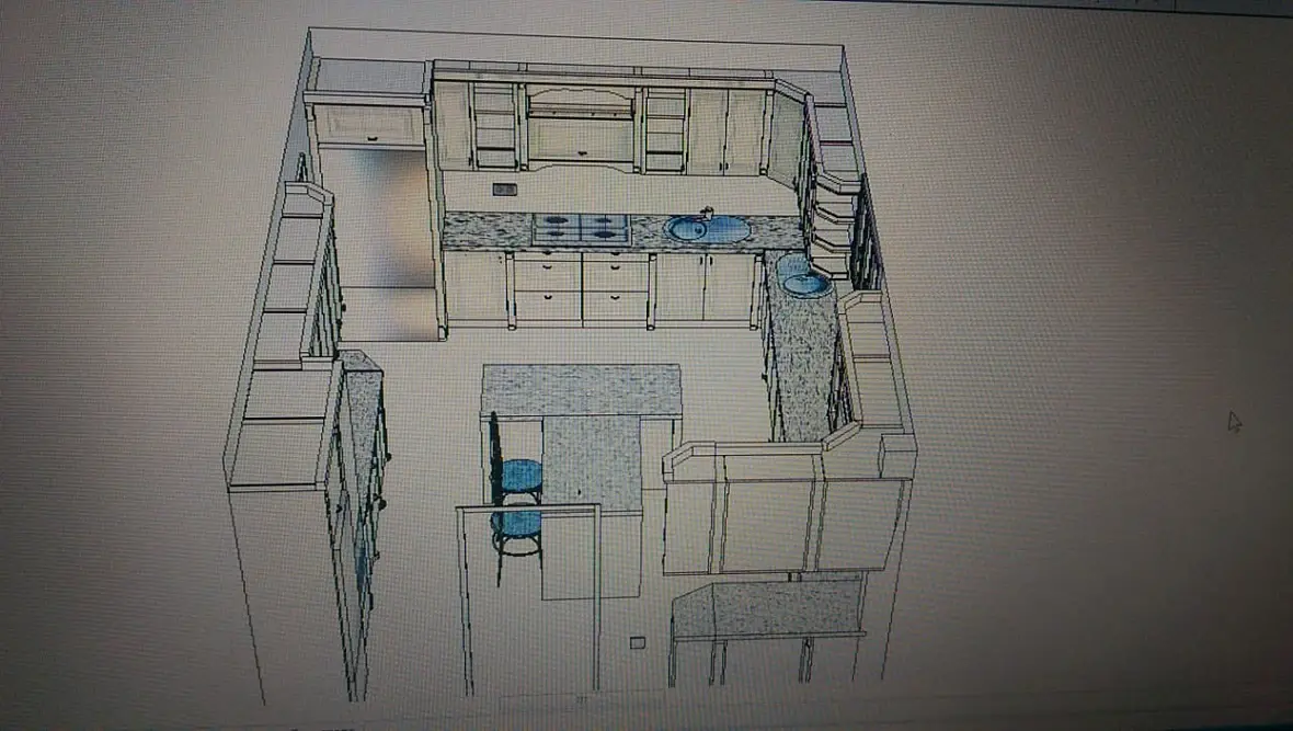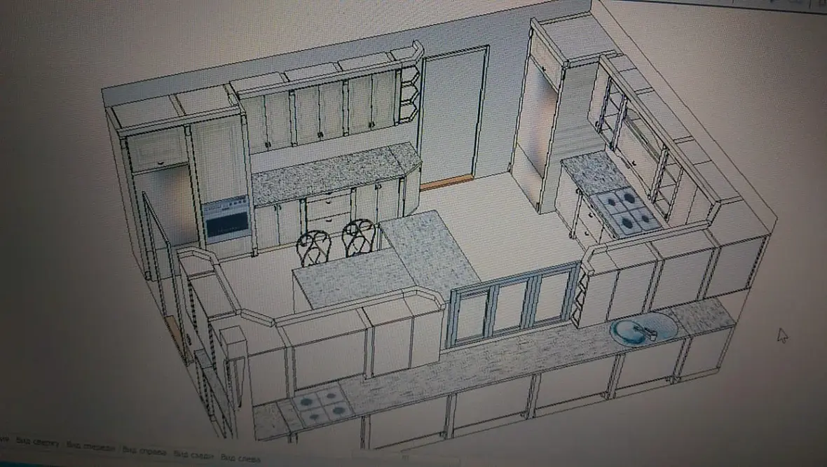 4) На следующий день, со мной связывается та самая девочка дизайнер, и объясняет мне что разместить две варочные там где я сказал, не возможно, подразумевались на 900мм. На что я ответил, что можно и все допуски проходят, а если заменить на 750, то совсем сказка будет, и вытяжки с газом рядом, и от двери в дом подальше. Вроде нехотя, но сказала что посмотрит. Потом был разговор о столешницах, они сказали что у них в городе только трех, метровые, а от этого больше стыковок, я зачем то начал объяснять что это не проблема, и заказать их вопрос одного-трех дней с любого из ближайших городов. Дальше был длинный диалог, из которого я понял, что она считает эту кухню просто очень большой, и переживает за перемещения повара и именно по этому решила сделать две кухни на одной, если так можно сказать. Приводя при этом пример своей кухни, где ей совсем не нужно перемещаться, все под рукой и холодильник и варочная и мойка и рабочая. Ну и дальше по списку, что треугольник не катит и т.д. В окончании разговора сходимся на том, что она мне высылает размеры помещения, я то ни чего не замерял, я раскидываю компоновку, каркасы и скидываю им в виде скринов из вьюпорта с описанием и основными размерами.