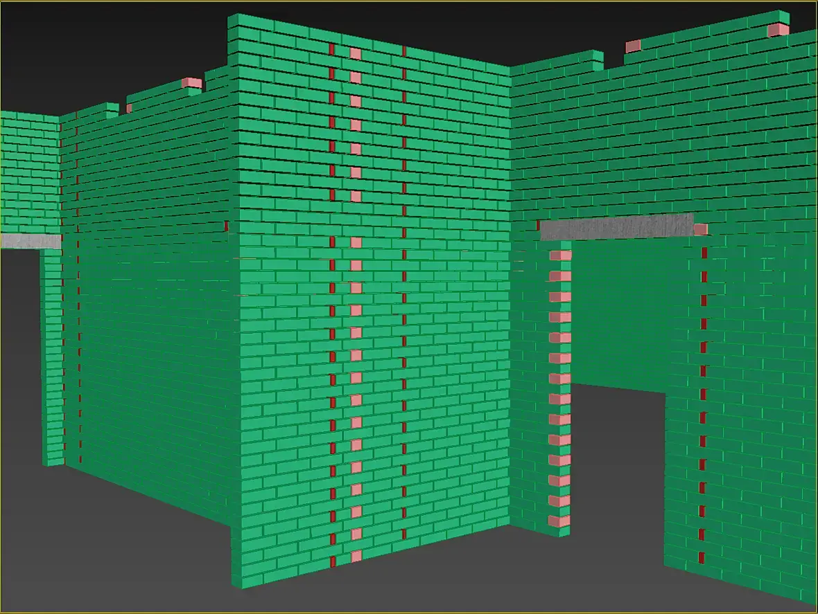 Всех приветствую, не много о текущем, закончил я раскладку кирпичной кладки а вместе с ней и газобетонные болоки. Боже, как приятно работать с газобетонном после кирпича. Модель с АГБ получилась вот такая, по цветам разделил размерность используемых блоков: