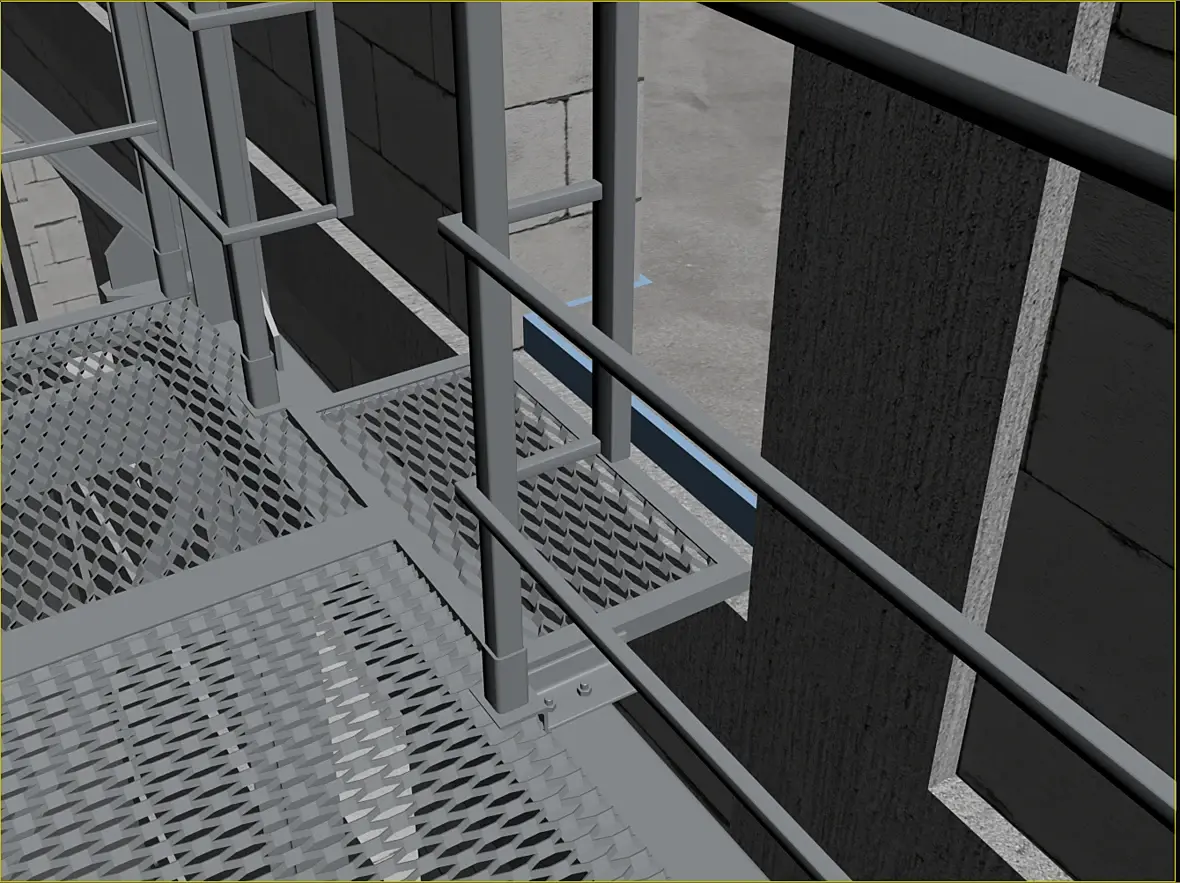 На картинке выше уже видны более внятно, так называемые трапы, лестница-то на расстоянии,на нижней видно более отчетливо что они еще и съемные. Сделал это по той причине, что фасад у нас вентилируемый, и монтироваться он будет после того как лестница будет смонтирована, значить и трапы, будут монтироваться после готовности фасада, ну или сниматься по необходимости.