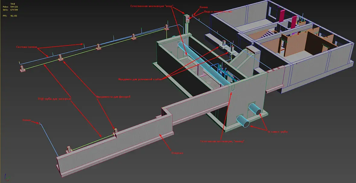 Как итог, по мимо прочих корректировок, у нас появился еще один этаж, рабочее название бункер, он полностью подземный, и закладывается перекрытие с учетом нагрузок не только от грунтов но и от грузового транспорта с грузом. Забегая вперед сразу напишу, была полностью закончена работа по грунтам и прилегающей территории, о ней позже, но отголоски вы будете видеть в виде опорных стен для грунта, фундаментов для осветительных столбов, стел и так далее... Общая структура: