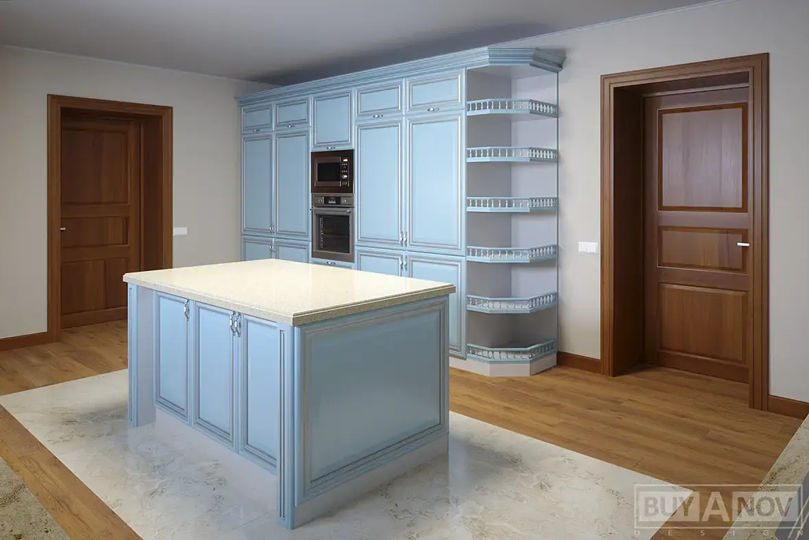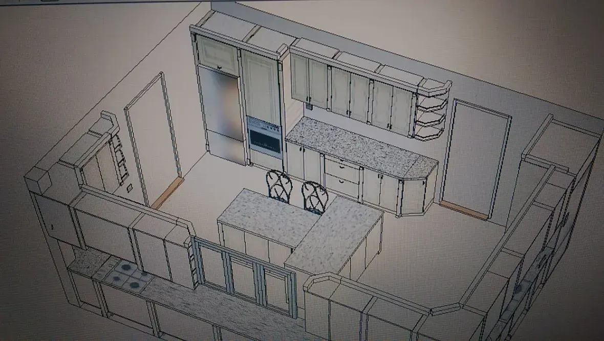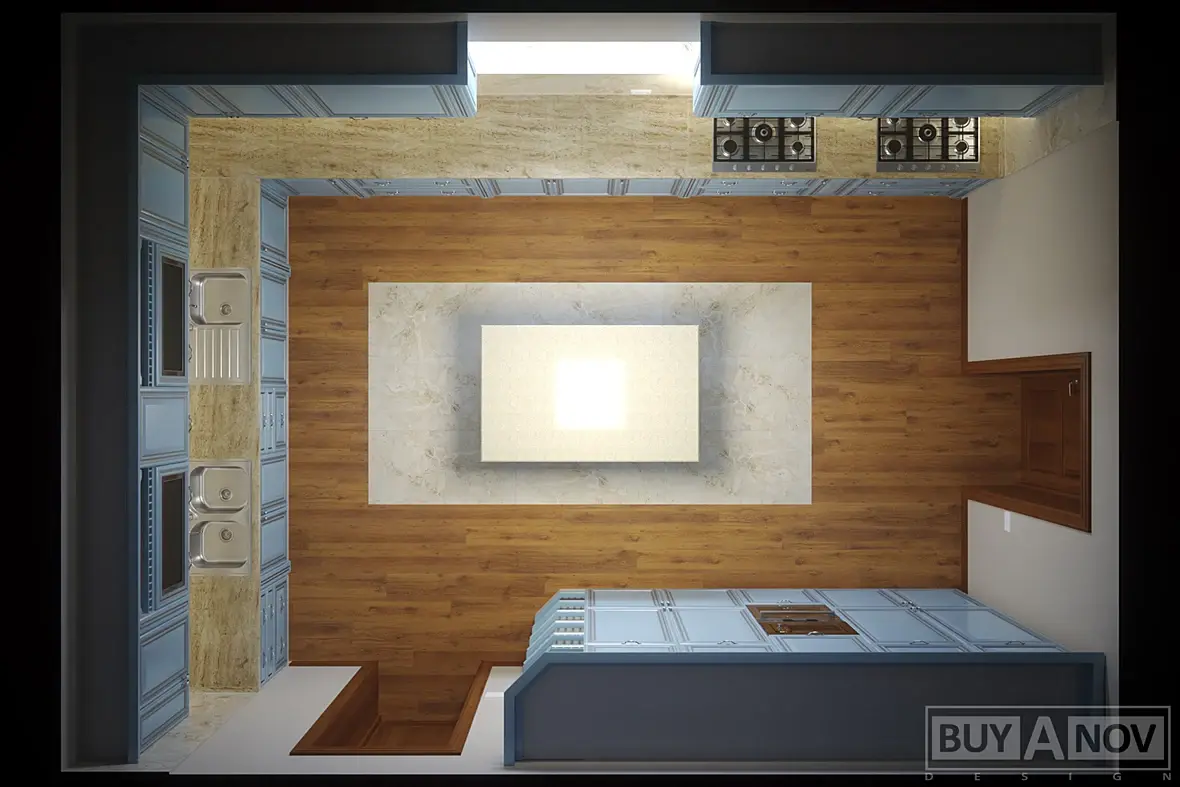 4) На следующий день, со мной связывается та самая девочка дизайнер, и объясняет мне что разместить две варочные там где я сказал, не возможно, подразумевались на 900мм. На что я ответил, что можно и все допуски проходят, а если заменить на 750, то совсем сказка будет, и вытяжки с газом рядом, и от двери в дом подальше. Вроде нехотя, но сказала что посмотрит. Потом был разговор о столешницах, они сказали что у них в городе только трех, метровые, а от этого больше стыковок, я зачем то начал объяснять что это не проблема, и заказать их вопрос одного-трех дней с любого из ближайших городов. Дальше был длинный диалог, из которого я понял, что она считает эту кухню просто очень большой, и переживает за перемещения повара и именно по этому решила сделать две кухни на одной, если так можно сказать. Приводя при этом пример своей кухни, где ей совсем не нужно перемещаться, все под рукой и холодильник и варочная и мойка и рабочая. Ну и дальше по списку, что треугольник не катит и т.д. В окончании разговора сходимся на том, что она мне высылает размеры помещения, я то ни чего не замерял, я раскидываю компоновку, каркасы и скидываю им в виде скринов из вьюпорта с описанием и основными размерами.