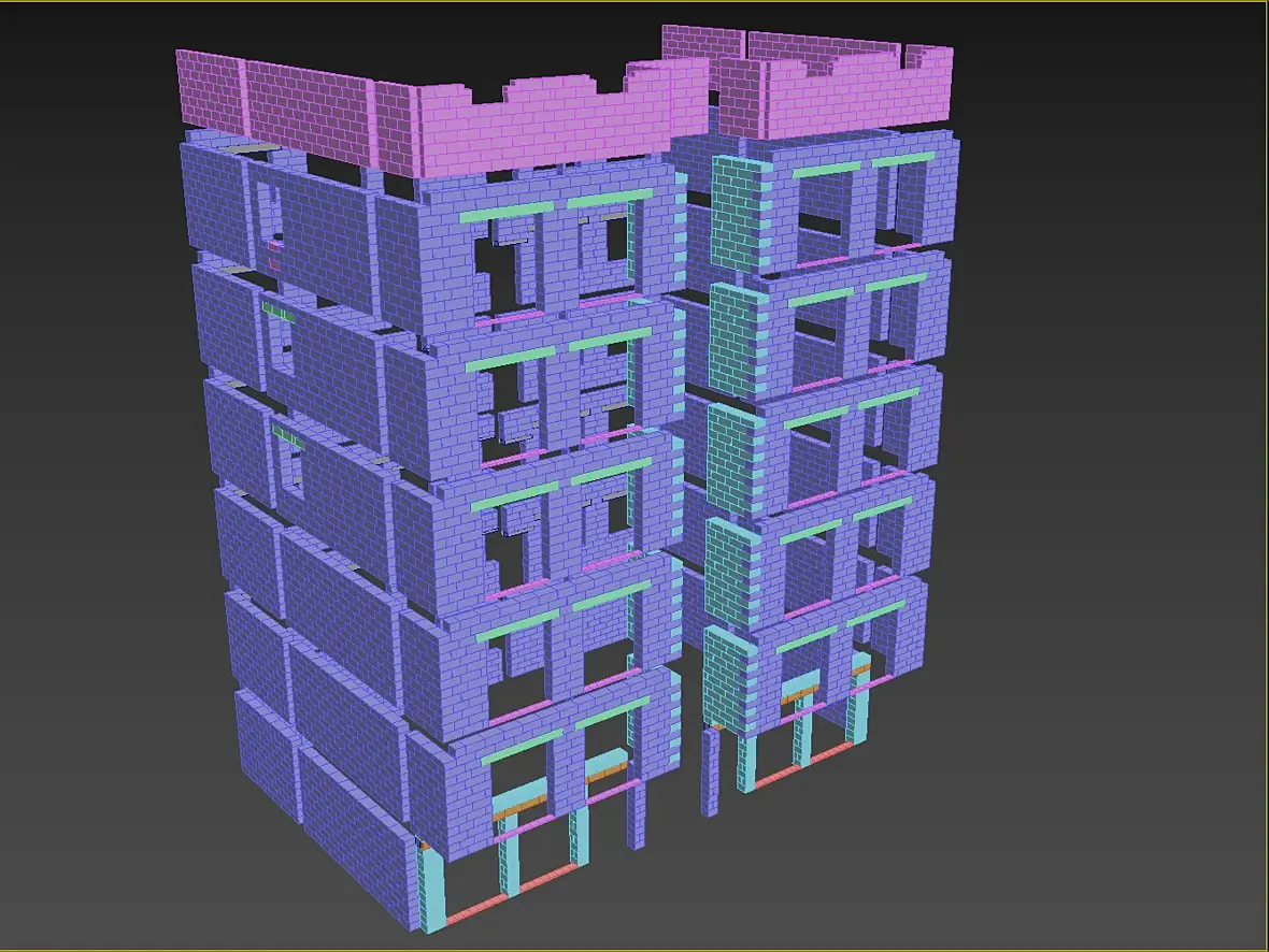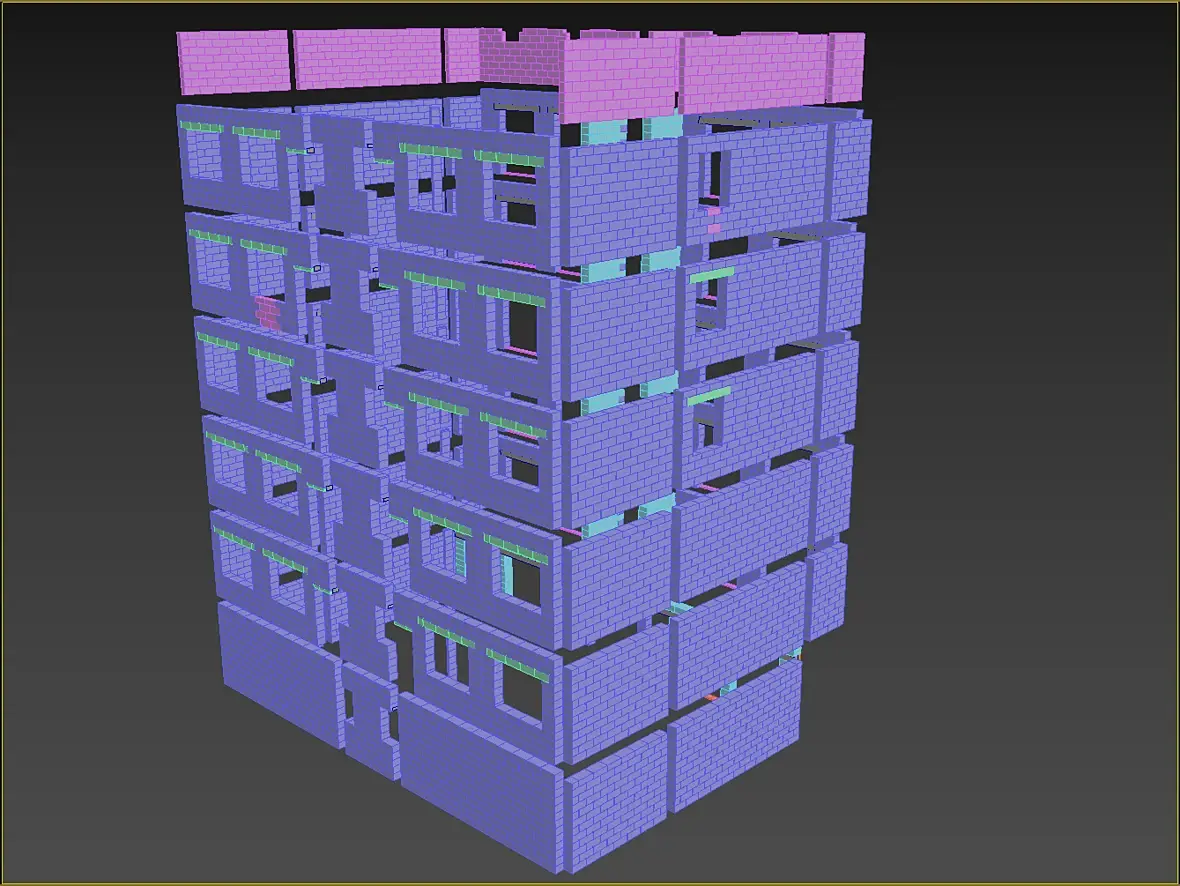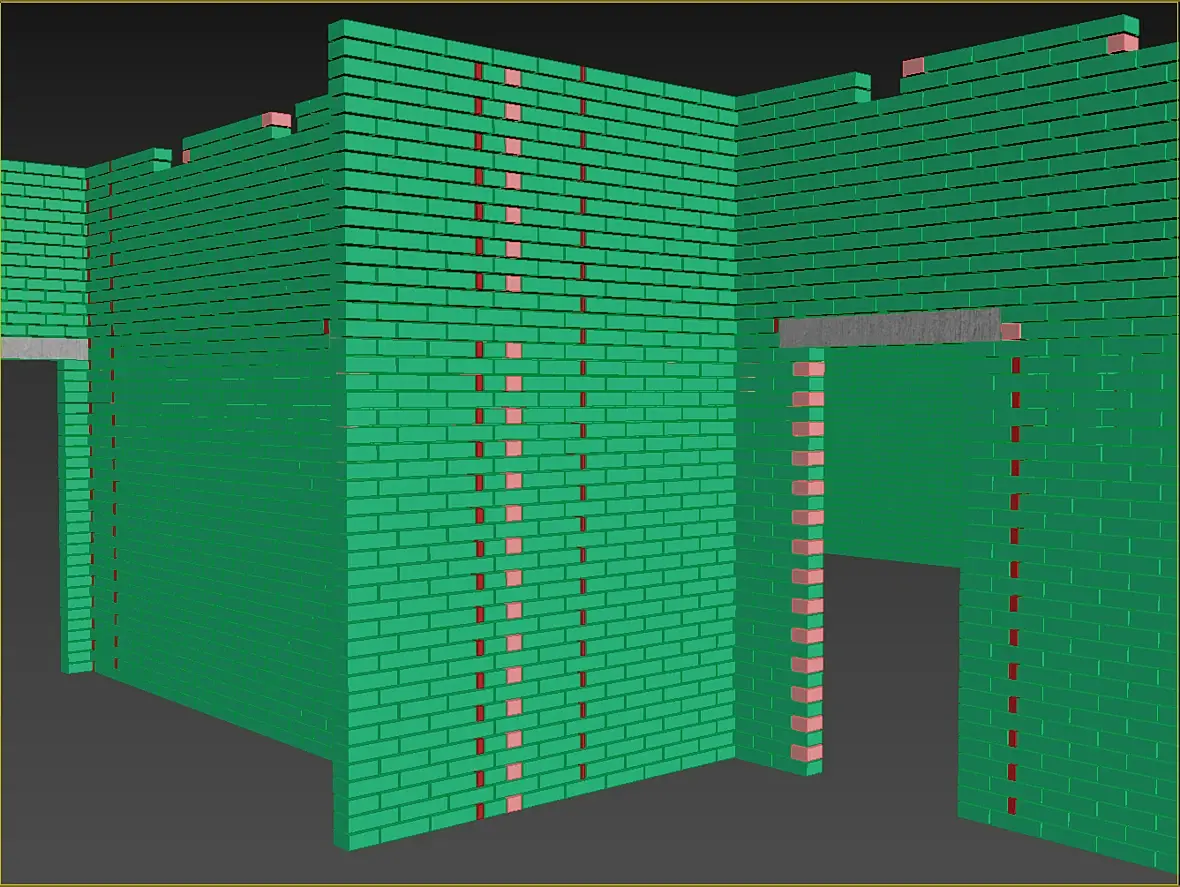 Всех приветствую, не много о текущем, закончил я раскладку кирпичной кладки а вместе с ней и газобетонные болоки. Боже, как приятно работать с газобетонном после кирпича. Модель с АГБ получилась вот такая, по цветам разделил размерность используемых блоков: