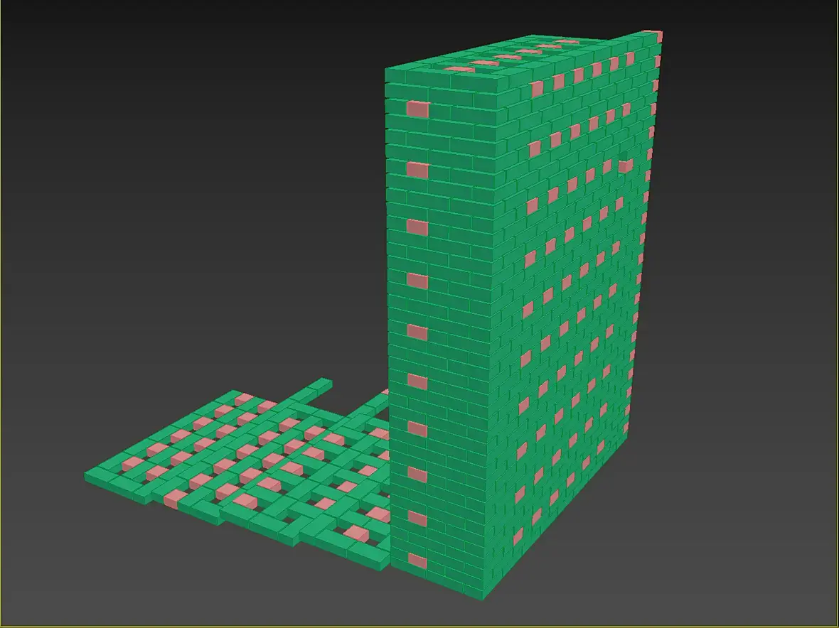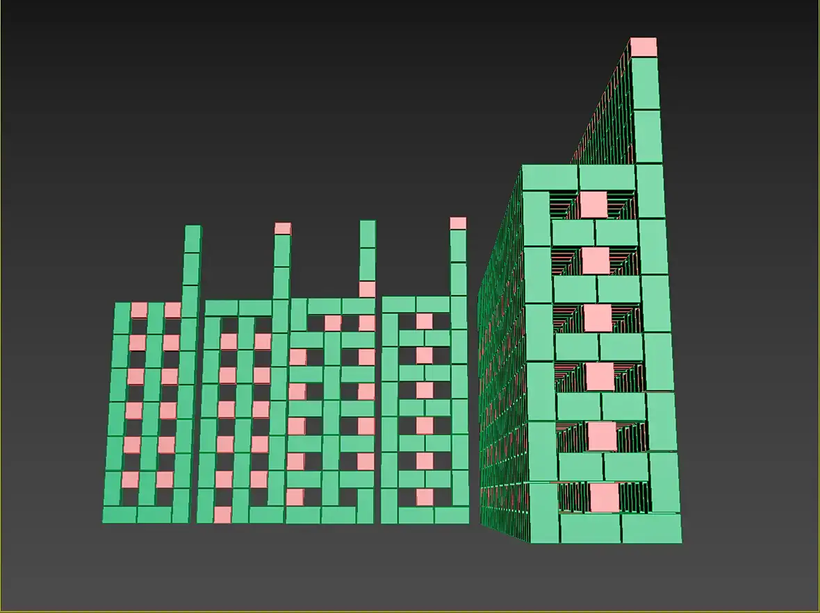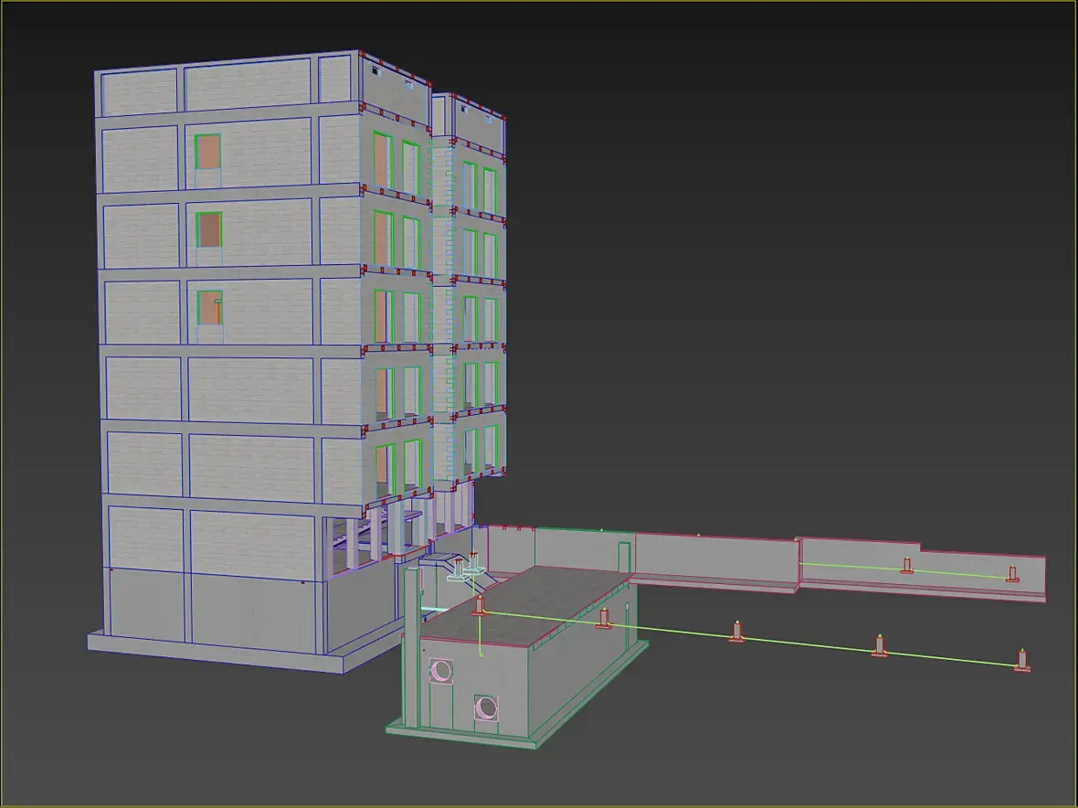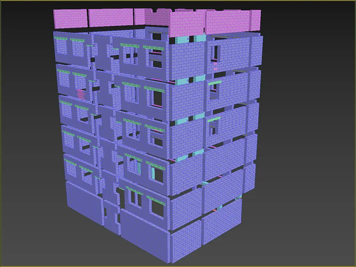 Всех приветствую, не много о текущем, закончил я раскладку кирпичной кладки а вместе с ней и газобетонные болоки. Боже, как приятно работать с газобетонном после кирпича. Модель с АГБ получилась вот такая, по цветам разделил размерность используемых блоков: