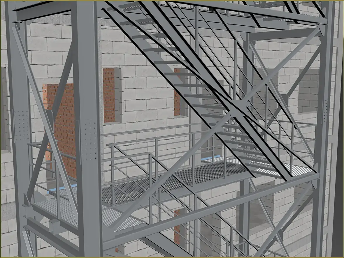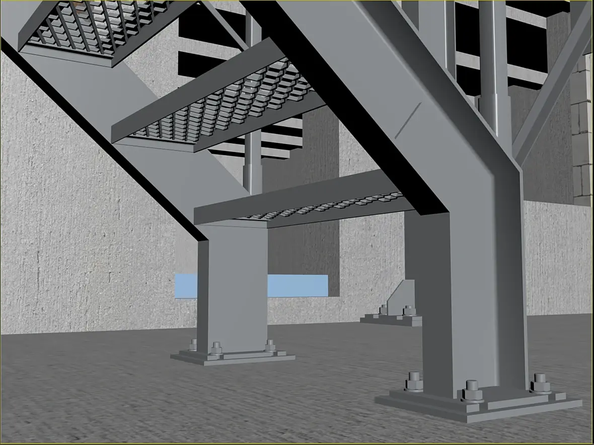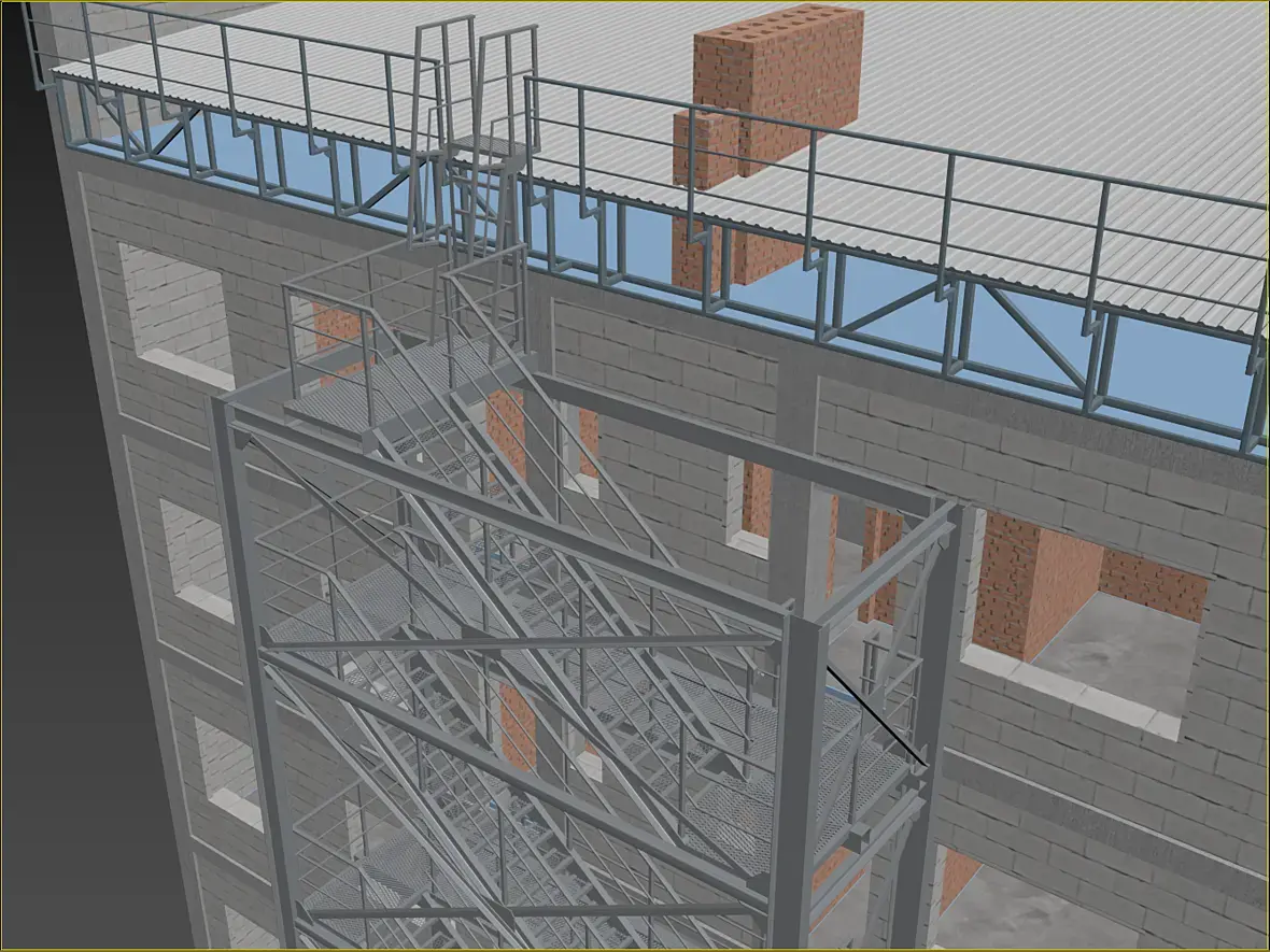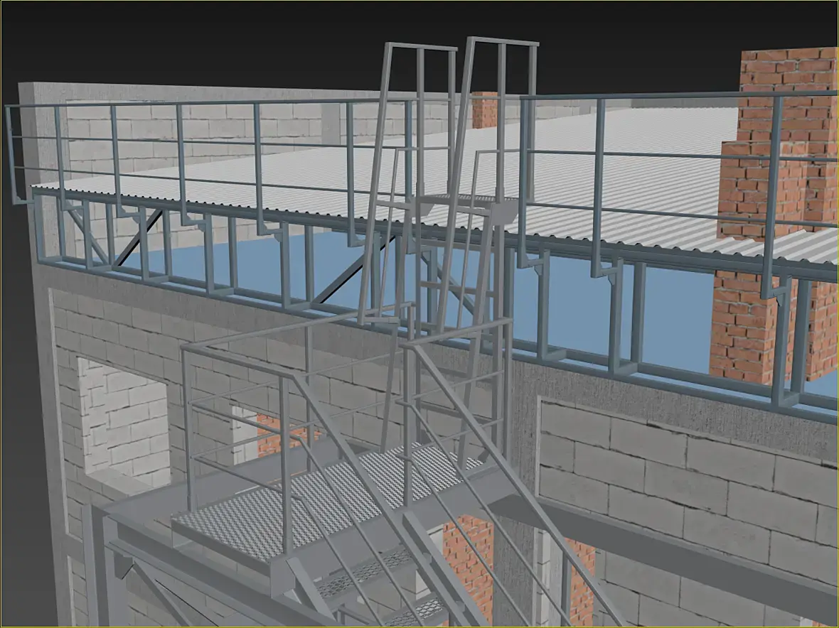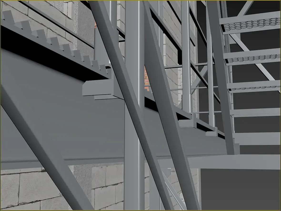 На картинке выше уже видны более внятно, так называемые трапы, лестница-то на расстоянии,на нижней видно более отчетливо что они еще и съемные. Сделал это по той причине, что фасад у нас вентилируемый, и монтироваться он будет после того как лестница будет смонтирована, значить и трапы, будут монтироваться после готовности фасада, ну или сниматься по необходимости.
