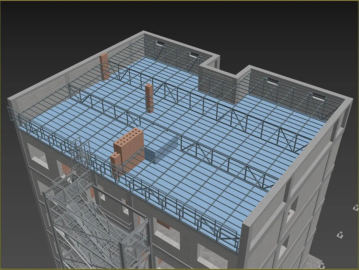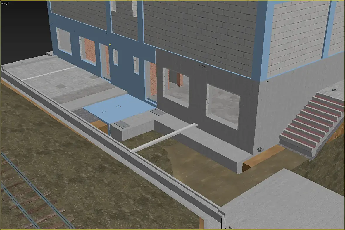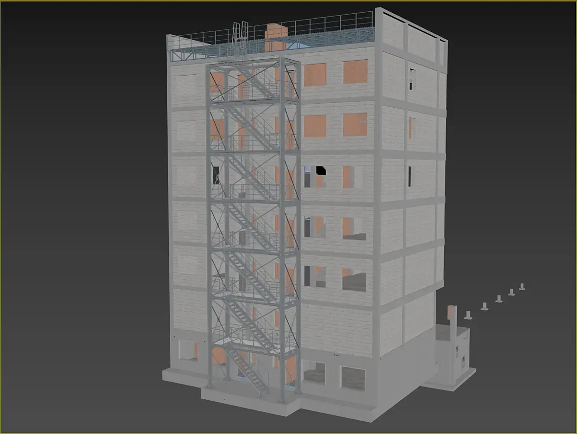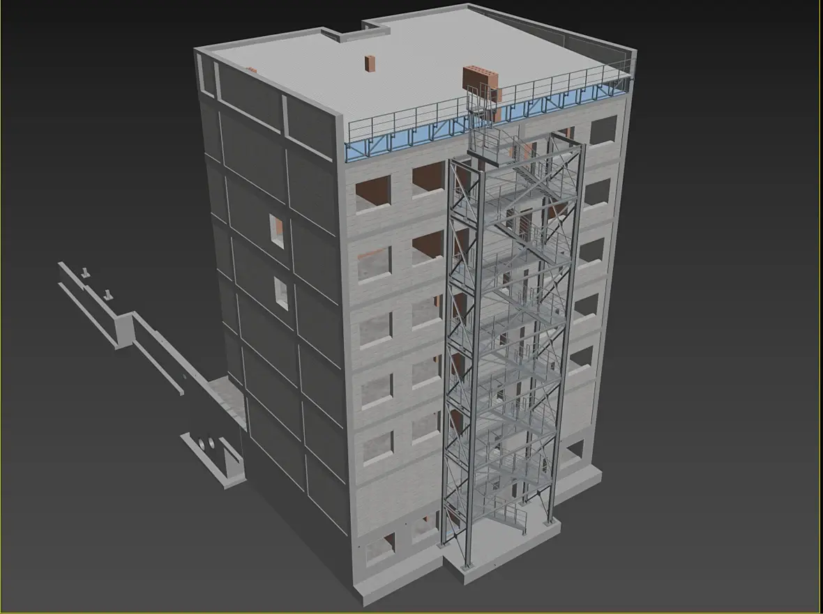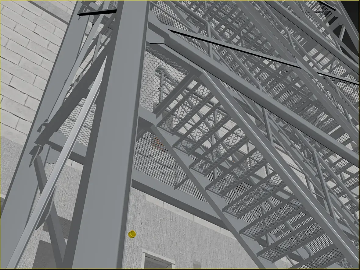 На картинке выше уже видны более внятно, так называемые трапы, лестница-то на расстоянии,на нижней видно более отчетливо что они еще и съемные. Сделал это по той причине, что фасад у нас вентилируемый, и монтироваться он будет после того как лестница будет смонтирована, значить и трапы, будут монтироваться после готовности фасада, ну или сниматься по необходимости.