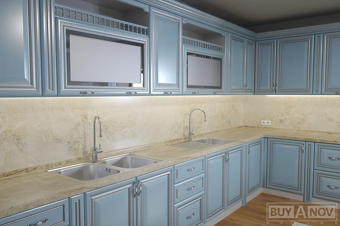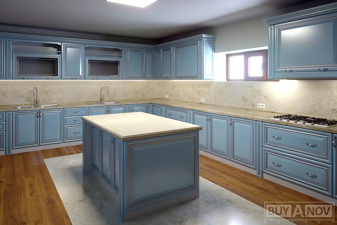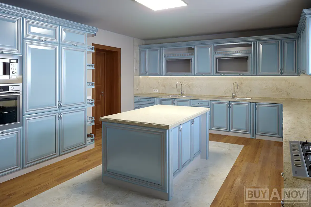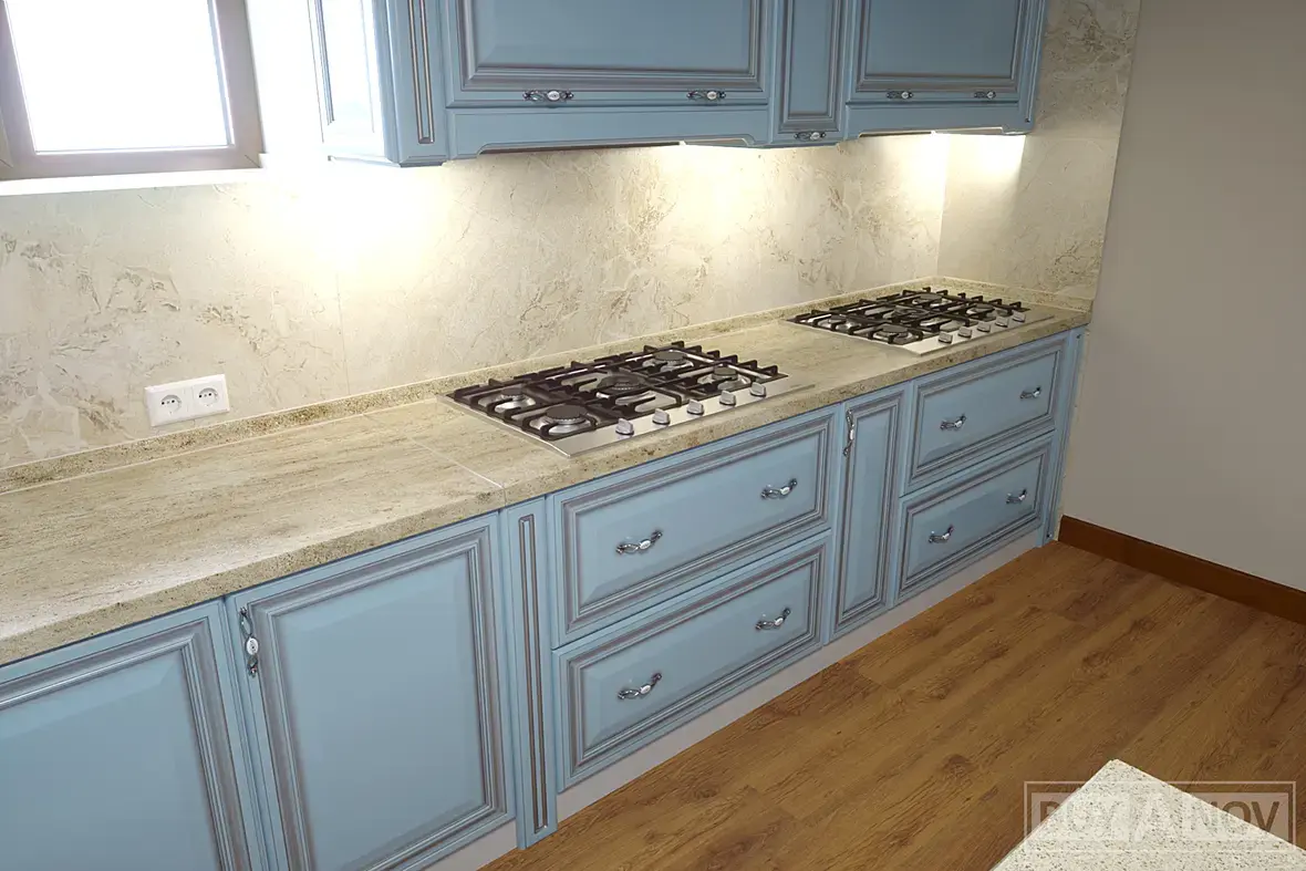 Далее мебель, я уточнил из чего и что выбрали, спорить не стал, выбрали, нравится ну и замечательно, будем думать над этим. А с выбором там все просто, дешевый фасад из МДФ с ПВХ, какого-то светло голубого цвета. Далее все стандартно, каркас из белого ЛДСП , столешница ДСП плита с постформингом. Ни чего против последних не имею, фасад только не очень люблю такой, но пусть будет. А вот компоновка мне не нравилась сильно... Больше всего не понравился вот этот не понятный письменный стол с приставкой для посетителей именуемый островной.