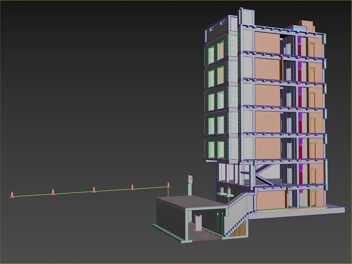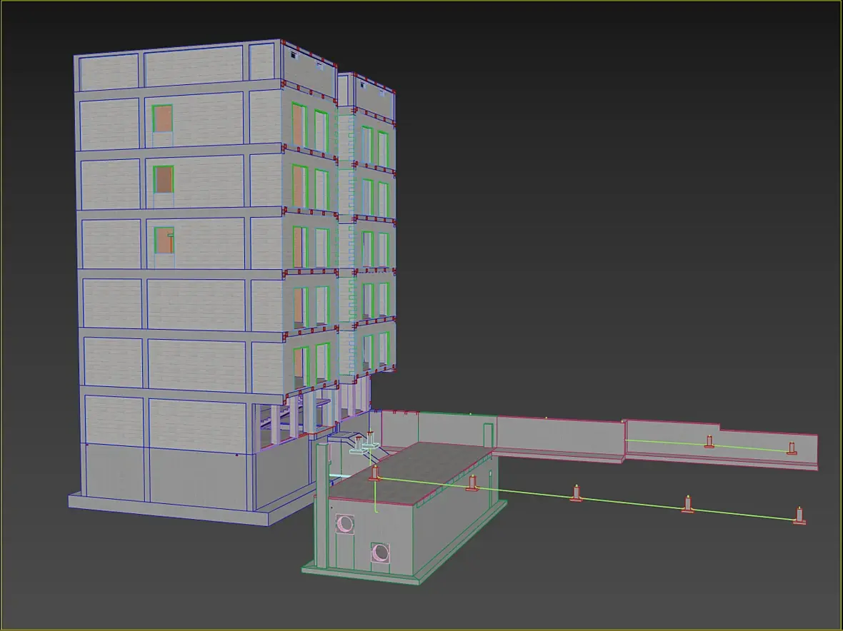 Когда подошел момент передачи, возник вопрос как, и они дали мне замечательный ответ, давай чертежи, в PDF. А для меня это прям совсем не весело, тем более что если будут корректировки. В итоге я им предложил закинуть все это в CAD, сам сильно переживал потянет он или нет, что то простое я закидывал, и то как это все двигалось меня совсем не радовало, вот прям как на костылях. Думал разбить все по кускам, по этажам может быть или еще как-то. А потом попробовал на ура, просто взял и все экспортировал. И чудо, он все съел, при этом все крутилось точно так же как и с простой моделью, сделал вывод что это просто его нормальное состояние. Не знаю как в более свежих версиях, но в той что у меня, 2012 архитектура, именно так. Дальше я накинул материалы, и все это дело отсортировал, получилось так:
