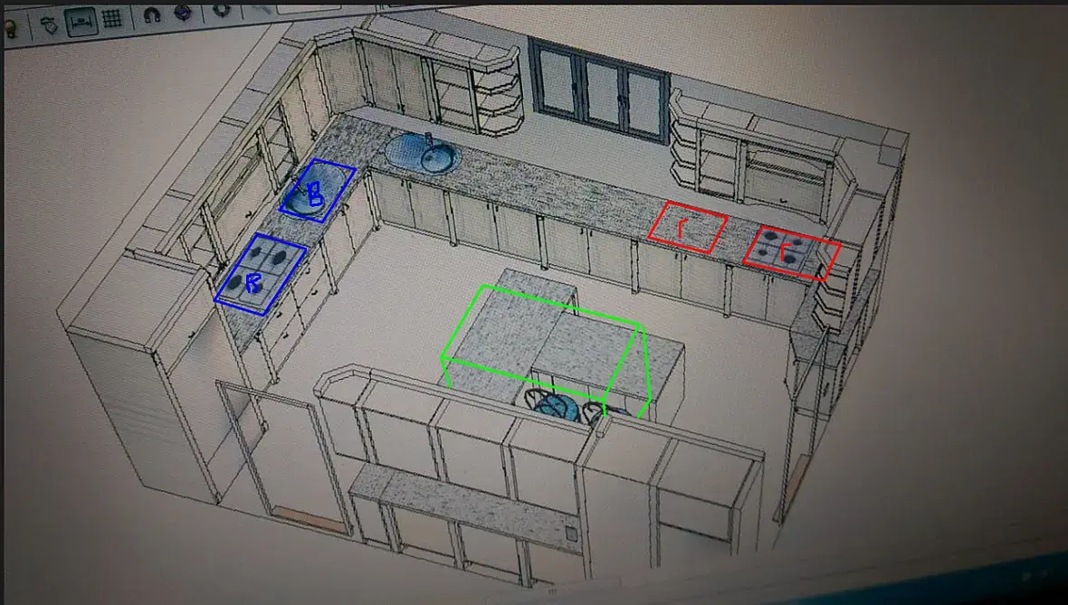 Не понравилось расположение раковин и варочных, на мой взгляд не удобно и сумбурно, да и пользоваться этими мойками будет точно не возможно двум хозяйкам сразу, а ТЗ было такое, как я разобрался. Плюс варочные, как, зачем? Ну ладно, хотят две, тут все норм, это не парадная кухня, это хозяйственная, где проходит куча готовки, все норм, тема известная, особенности региона. Но зачем в разных местах? Коммуникации подключать не удобно. Место около каждой варочной становится бесполезным для другого оборудования. Ну и на мой взгляд нарушается конвейер. Следующее что не понравилось, два холодильника, не встроенных, как позже выяснилось один холодильник, другой морозильник. Так еще и с разной отделкой и разных размеров. Как итог, на месте с хозяйкой, сразу рисуя на полу, обсуждаю и согласовываю, последнее слово можно подчеркнуть, следующее. Красным отметил положение варочных, синим мойки, и зеленым форму островного, он будет просто прямоугольным и столешницы меняются на искусственный камень, что бы получить нужный размер и монолитность.