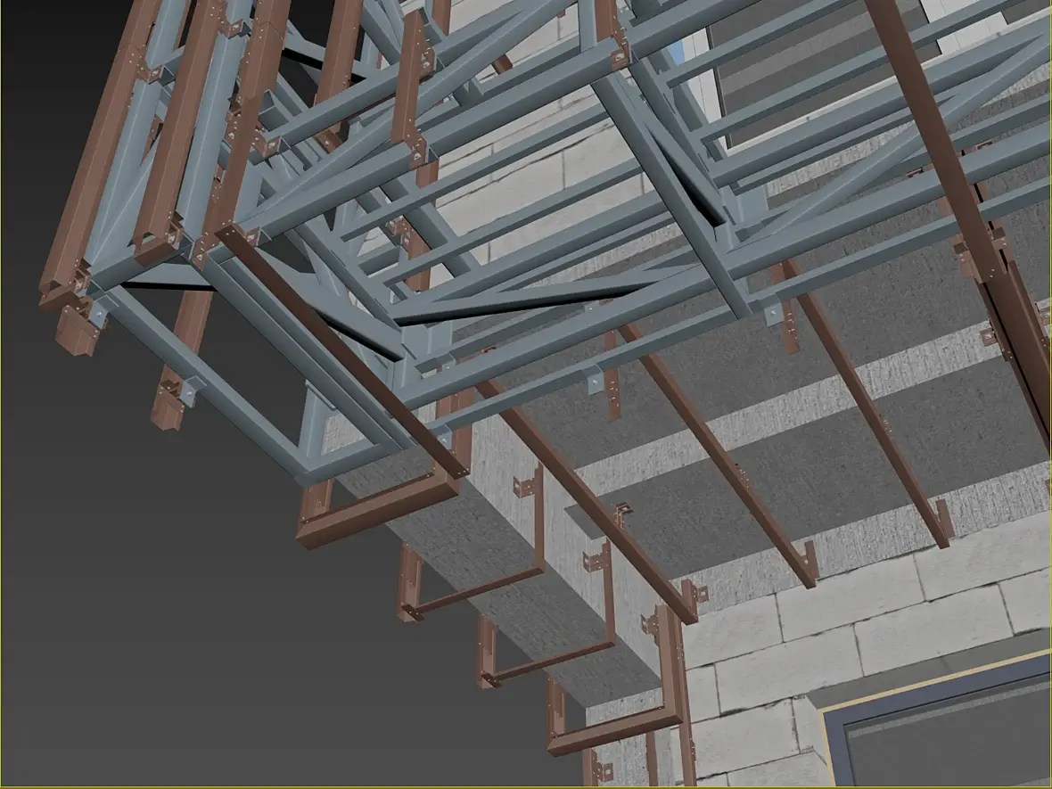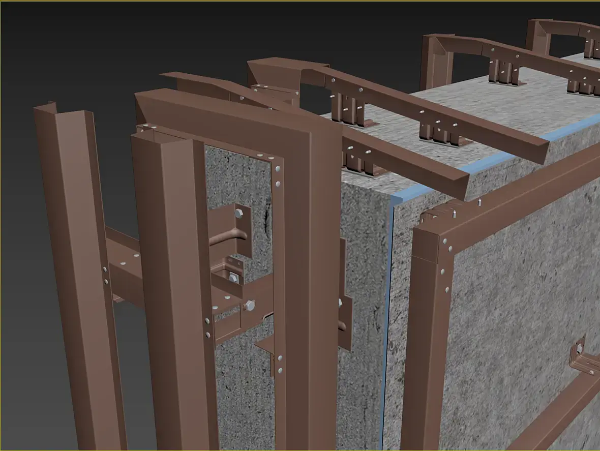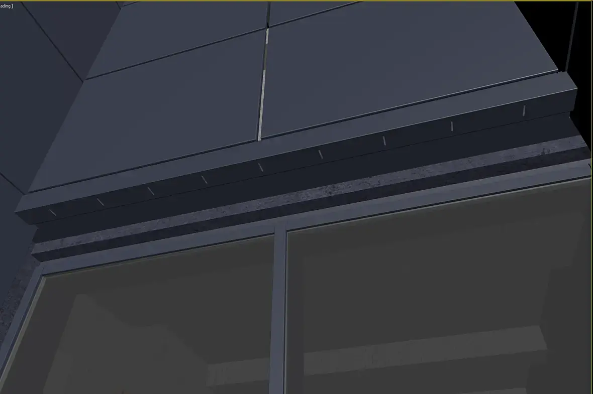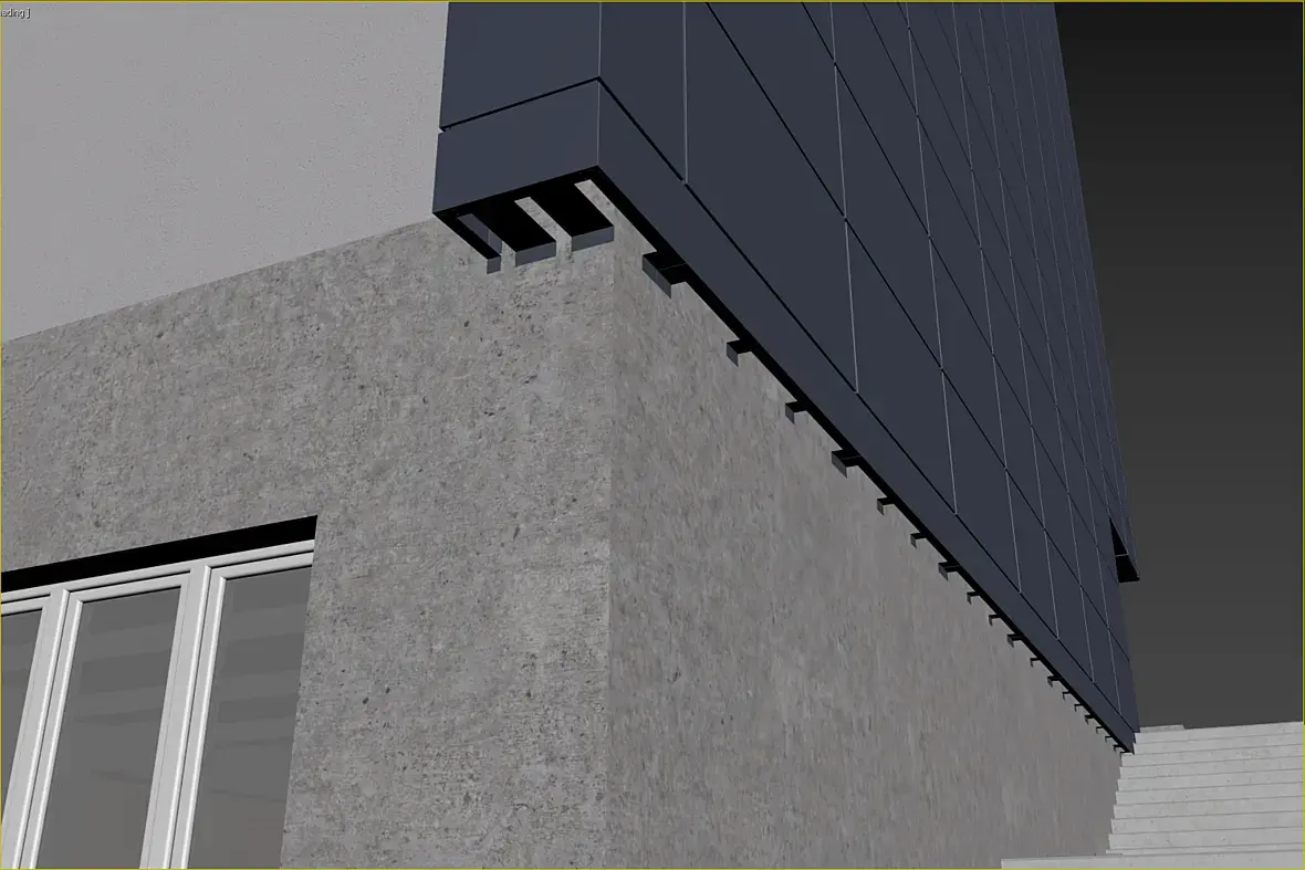 Само собой, уклон у нас идет из-за кровельной части этого козырька, и тут тоже было где повозиться, давайте разберу чуток. Вот этот же узел в сборе, кстати перфорированные кассеты основного фасада предполагаю 50 мм, остальные 25 мм, для того что бы сократить количество вертикальных элементов, надеюсь это даст пройти по ветру на изгиб кассеты за счет большего ребра.
