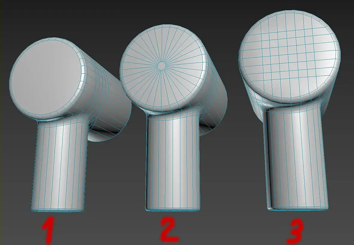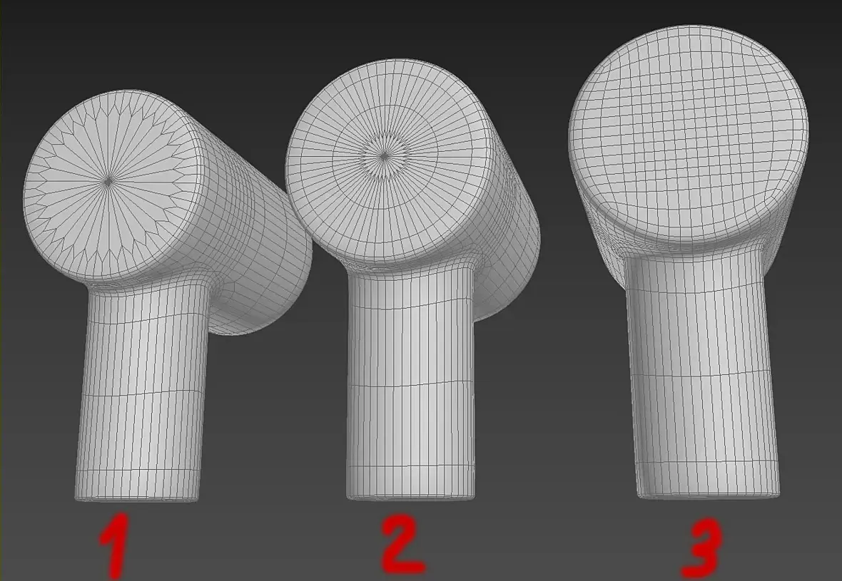 У вас второй вариант имеет многоугольник, это намного хуже треугольников. Нужно стараться избегать многоугольников, и исходящих из точки лучей больше чем 5. Все остальное приемлемо в большинстве случаев за малым исключением. Ещё плохо иметь такие углы в сетке.