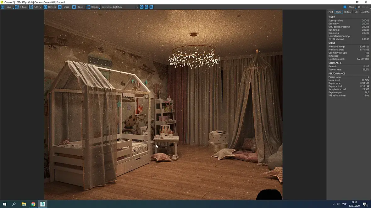 Ну и ракурс еще можно подрихтовать - сейчас искажена кроватка и неудачно обрезана люстра.