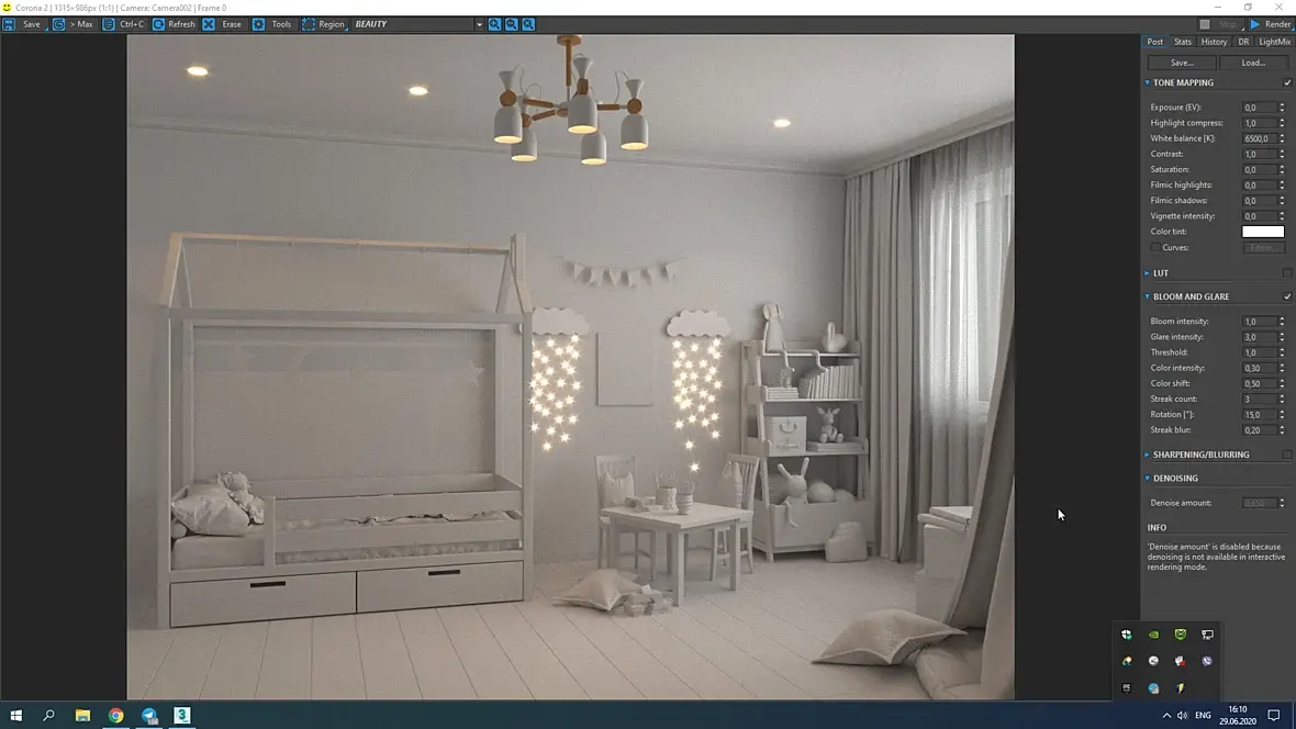 За окном небо включи немного. Экспозицию подними. Компрессию пересветов зкрути. Баланс белого холоднее сделай. Точки на потолке можно включить, посмотреть, как с ними. И вообще, ночной вид имеет смысл делать, если есть световое зонирование, сценарии освещения. Торшеры там, лампочки маленькие, споты направленные. И лучше вечер, а не глубокую ночь. И люстра шуметь будет.