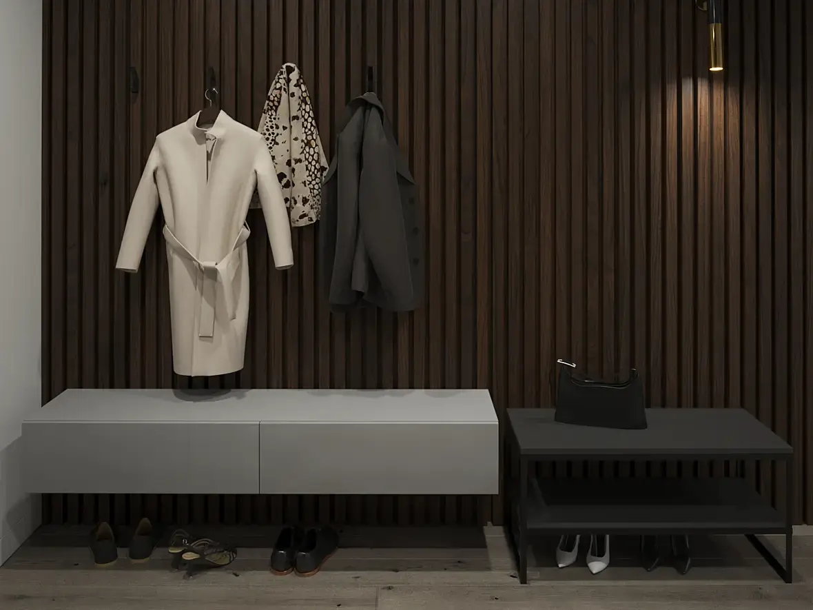 В прихожей, ванной и раздевалке очень хмуро, прям совсем безрадостно. Выключатель этот белый в черной рамке ещё... :)