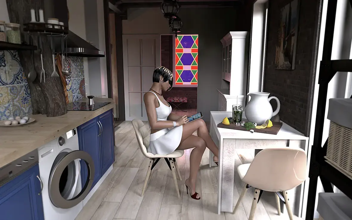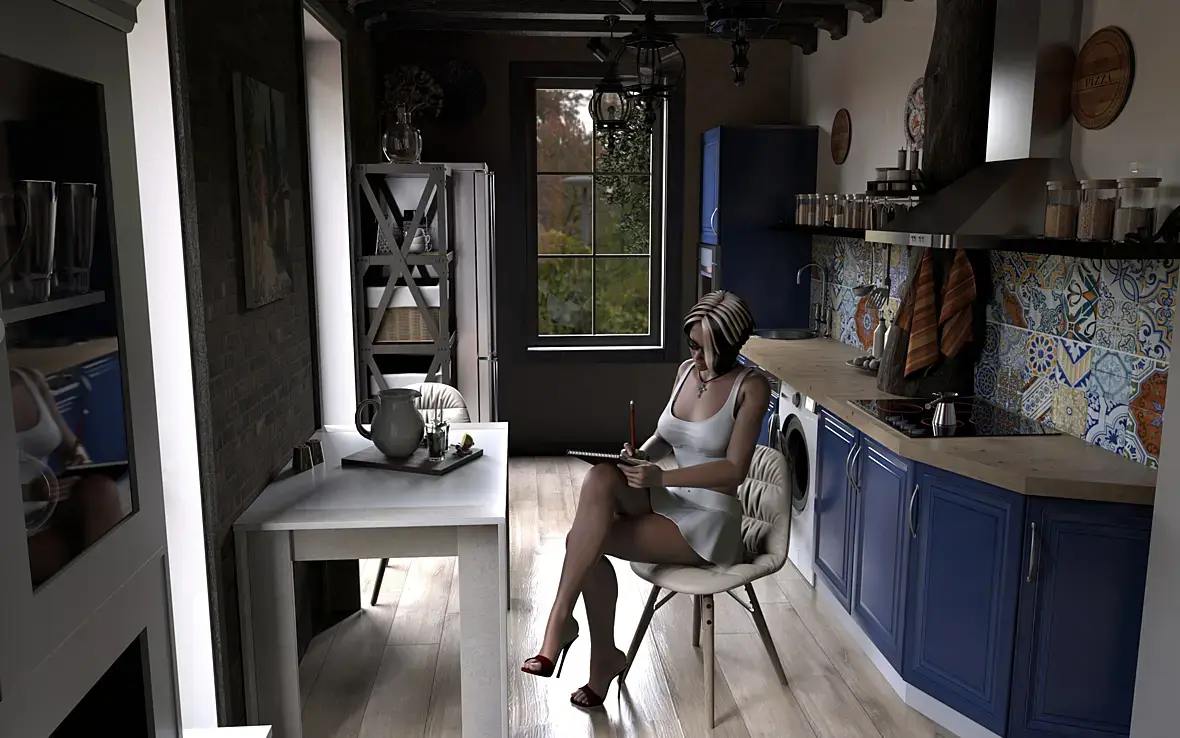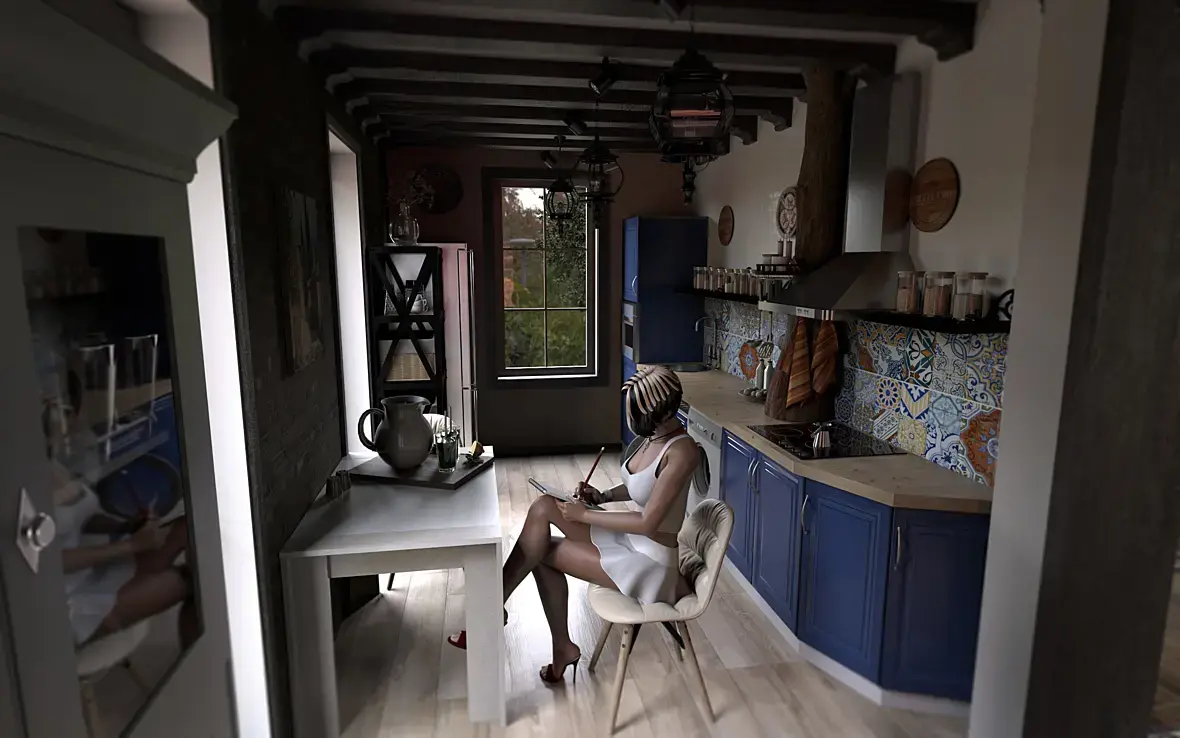 Постарался учесть ошибки: материалы немного улучшил, вроде больше не тайлятся, сделал на столе небольшую фаску, дверь и правда странно смотрелась без сдвижного механизма (замоделил), приглушил витраж, постарался убрать пересвет, поправил масштаб кувшина, изменил положение тела дамы (так мне кажется поинтереснее). От фотореализма конечно далековато но ... Как думаете готово такое для галереи?) Или