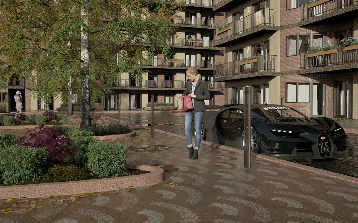 Не думаю что даже в клубном ЖК кто-то бы владел, а уж тем более во дворе запарковал Бугатти . Такие обычно у шейхов в гаражах стоят. Да и в целом даже если поставить какую-нибудь Феррари - она всё равно внимание будет на себя оттягивать. По этому надо тачку поспокойнее, которая вроде бы и есть, но она настолько неприметна, что её как бы и нет)))