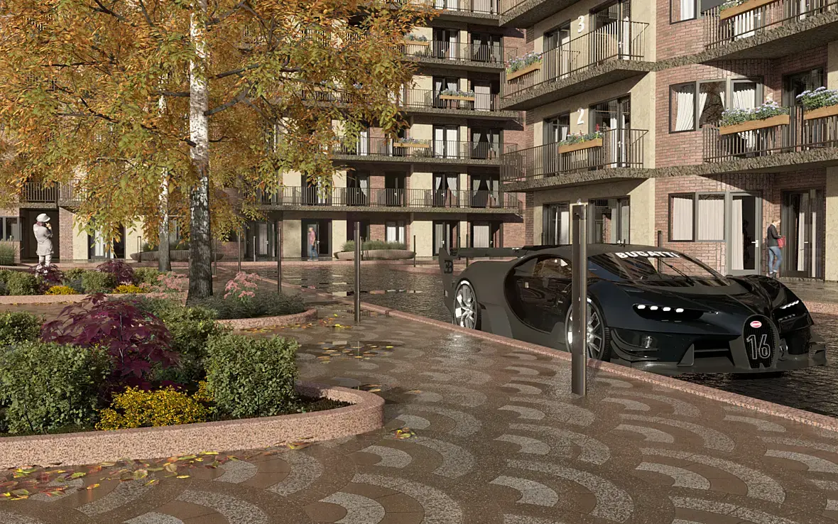 Не думаю что даже в клубном ЖК кто-то бы владел, а уж тем более во дворе запарковал Бугатти . Такие обычно у шейхов в гаражах стоят. Да и в целом даже если поставить какую-нибудь Феррари - она всё равно внимание будет на себя оттягивать. По этому надо тачку поспокойнее, которая вроде бы и есть, но она настолько неприметна, что её как бы и нет)))