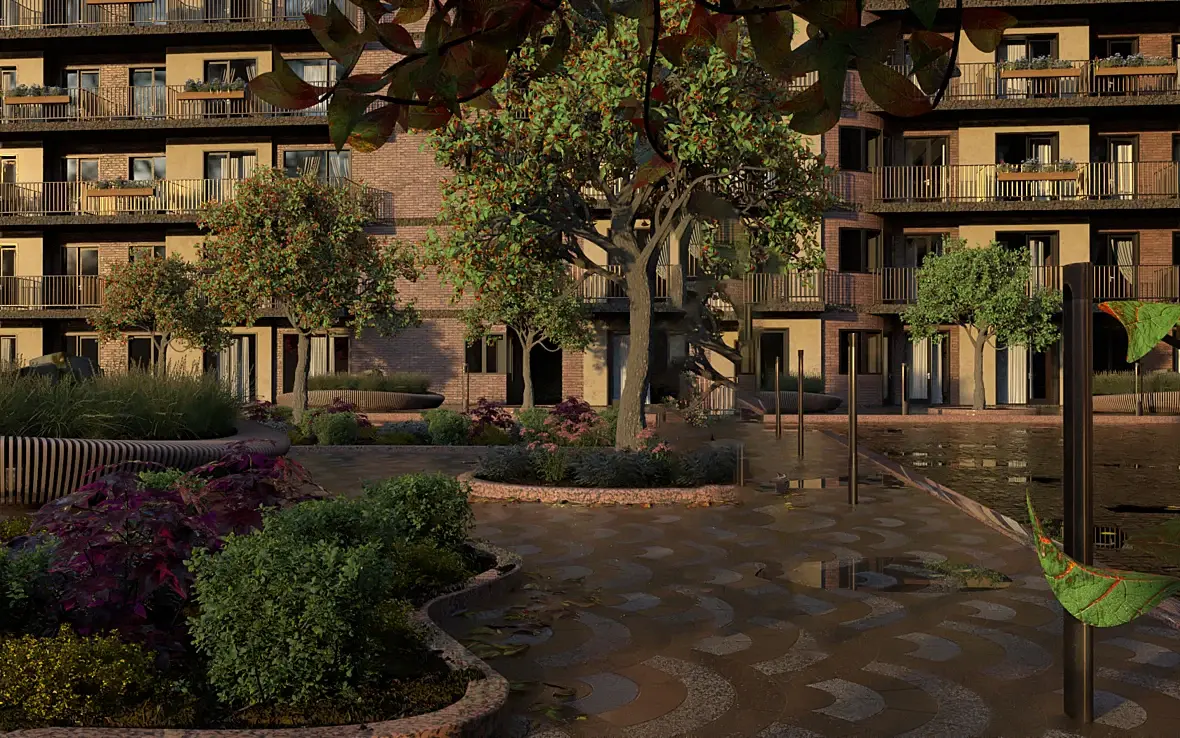 на фото в данный момент тотально пасмурная погода да еще и вечереет. Я бы немного подтянул фото к нормальному дневному освещению для начала а потом подтянул к нему освещение площадки.