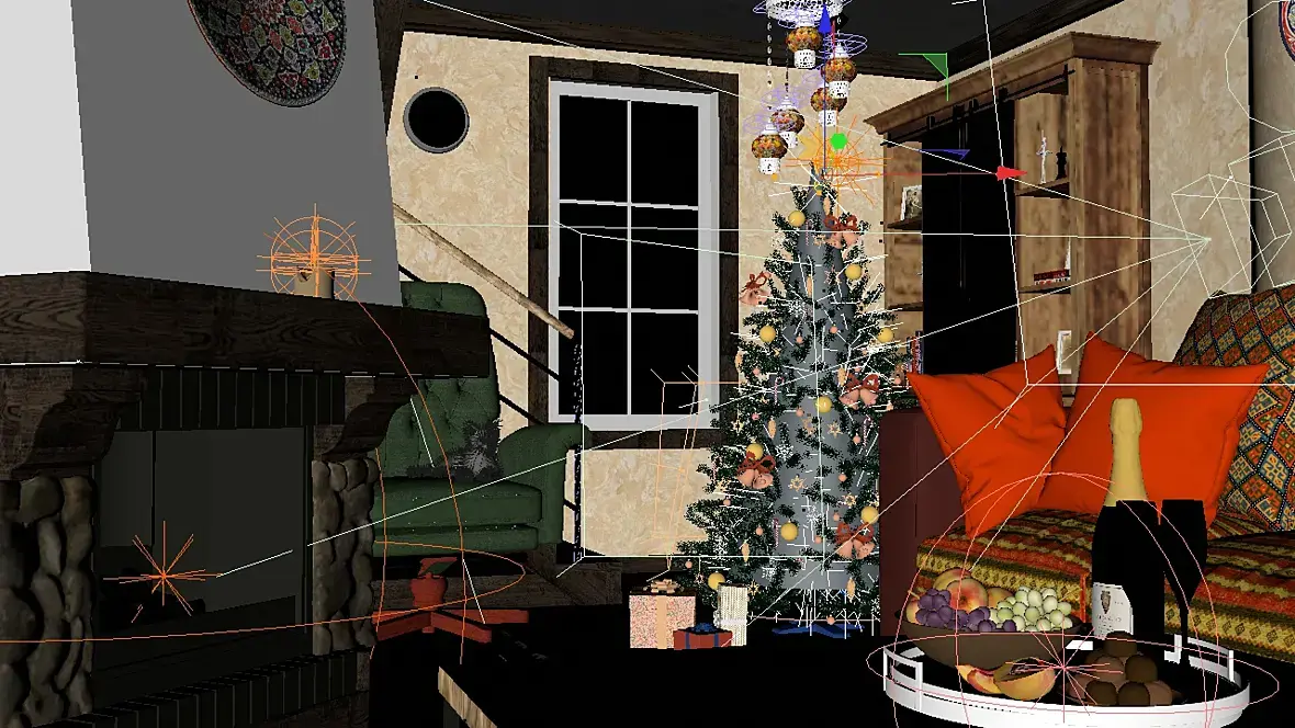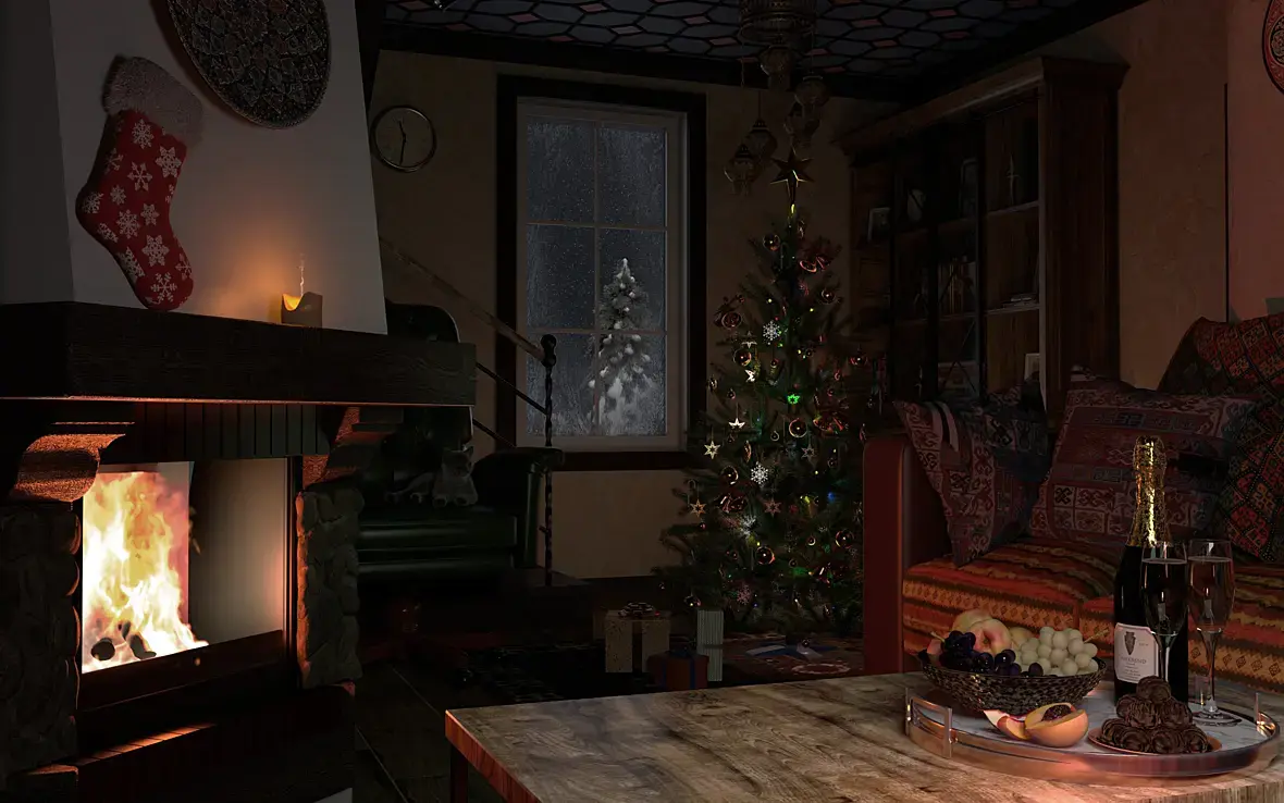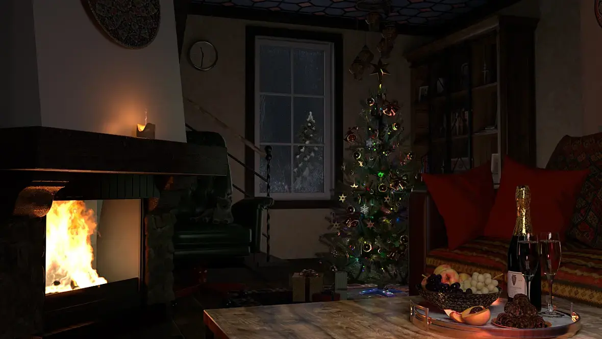 Бутылку с фруктами освещает белый эриа и теплый поинт,  оранжевый поинт в камине, два поинта в свече (один на воск, другой на пламя), напротив кресла эриа на 0 немного продлевает силу от освещения на переднем плане и дает блики, елочка: по конусу клонером размещены 50 самосветящихся разноцветных огоньков сдвоенных с поинтами того же цвета, на конус так же накинут эриа, под и над елкой эриа диск, полукругом в сторону окна эриа прямоугольники, на них текстура разноцветных огоньков.