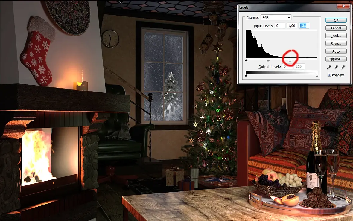 Огонь символизирует вечность и он главный. Елочка светиться во мраке и не нарушая единства человека и пламени символизирует время. Кот символ мудрости и родственник символа наступающего года. Причем свет идущий от елочки есть и он приблизительно физически корректный (рассчитал исходя из количества и мощности фонариков и настроил эриа лайт который конусом по периметру елки), под елкой есть пятно и тени над шкафом указывают на это.     В целом я согласен, что надо скорректировать то, что за окном, но сильно поднимать освещение я считаю не надо, это всю магию разрушит.