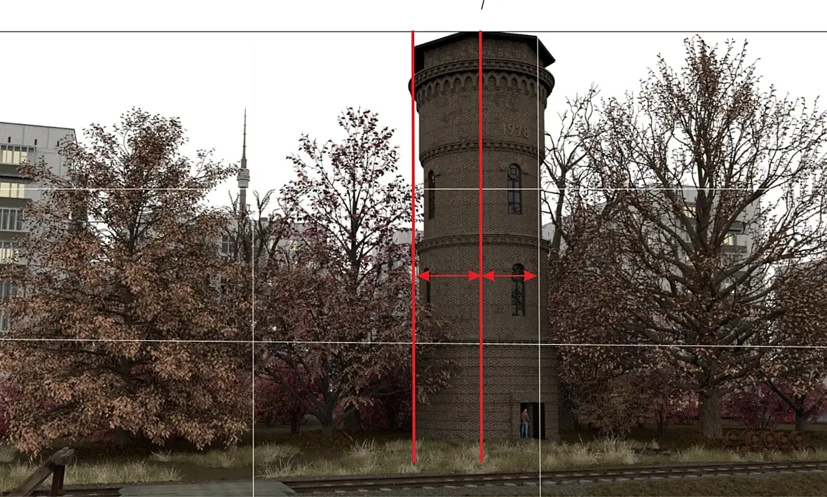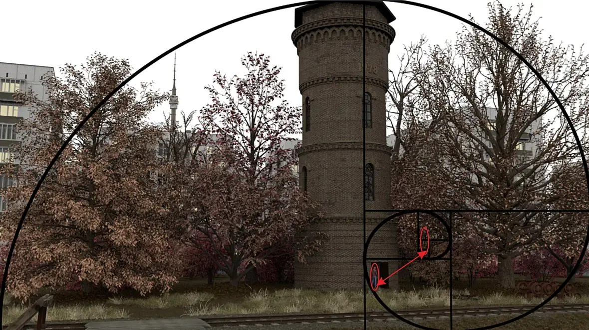 Наоборот, на изображении главное не башня, а человек который стоит у основания в проеме двери. Третья идет практически точно по проему при этом находится в воронке внимания спирали. Вариант который предложил Nick_pan хорош и я даже попробовал, но тогда потеряется главное - человек, я буду рендерить  финал 2560х1600 при таком разрешении его будет видно хорошо. Если башню отодвинуть, изображение теряется