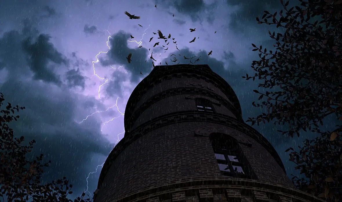 Здесь стоит поработать над отдельмины объектами. Башня вообще не детализирована, выглядит как лоуполи модель с текстурой. Сюда бы поезд. Зачем человек идет в башню? На что он оборачивается?