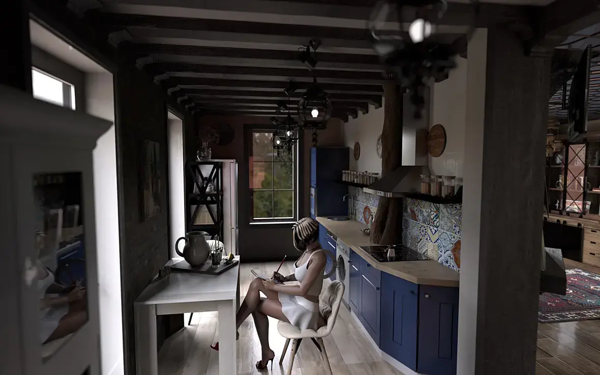 Постарался учесть ошибки: материалы немного улучшил, вроде больше не тайлятся, сделал на столе небольшую фаску, дверь и правда странно смотрелась без сдвижного механизма (замоделил), приглушил витраж, постарался убрать пересвет, поправил масштаб кувшина, изменил положение тела дамы (так мне кажется поинтереснее). От фотореализма конечно далековато но ... Как думаете готово такое для галереи?) Или