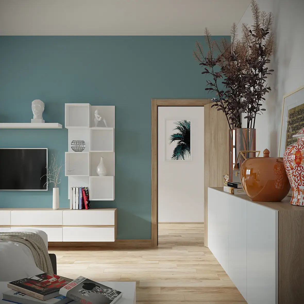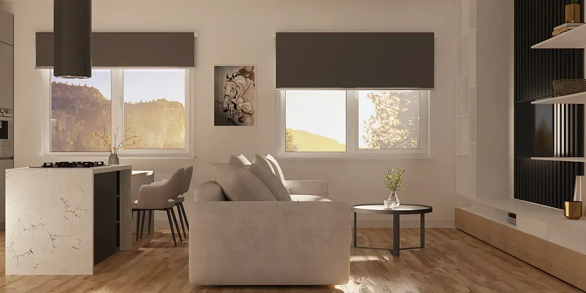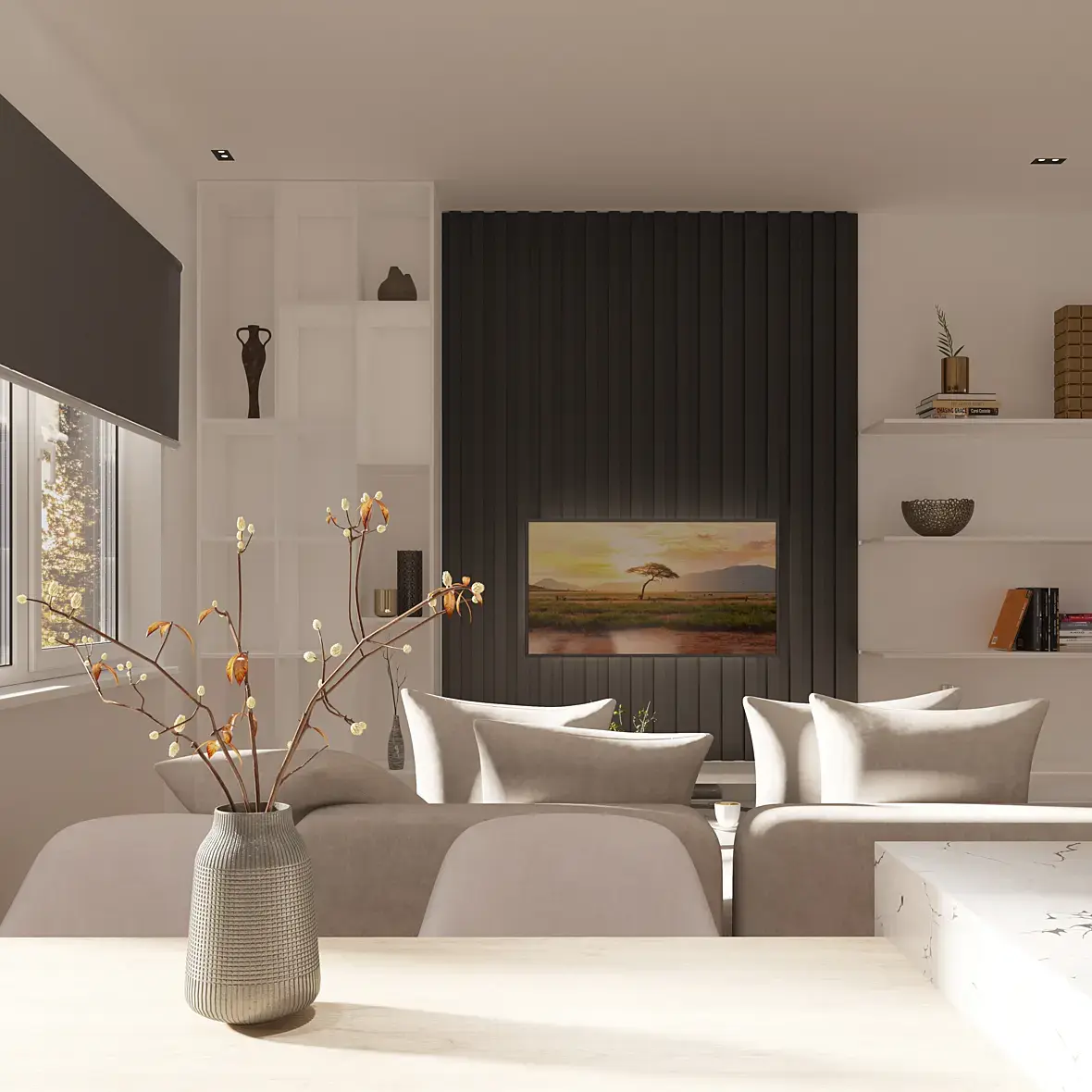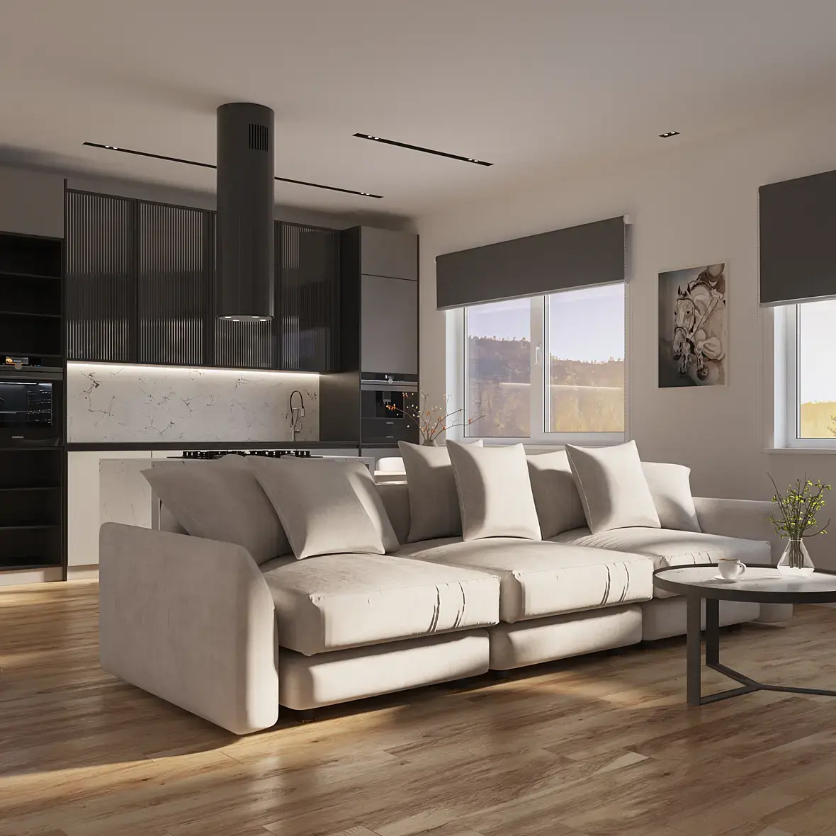 Светильники в виде черный дырок выглядят некрасиво и расположены как-то хаотично, это напрягает. На первом рендере засвечены подушки и столешница справа выглядит очень острой. На втором есть непонятные тени на диване. На всех рендерах я бы сделал поменьше света из окна, и больше света от ламп, чтобы не засвечивался диван. На остальных все хорошо, не учитывай пересвета