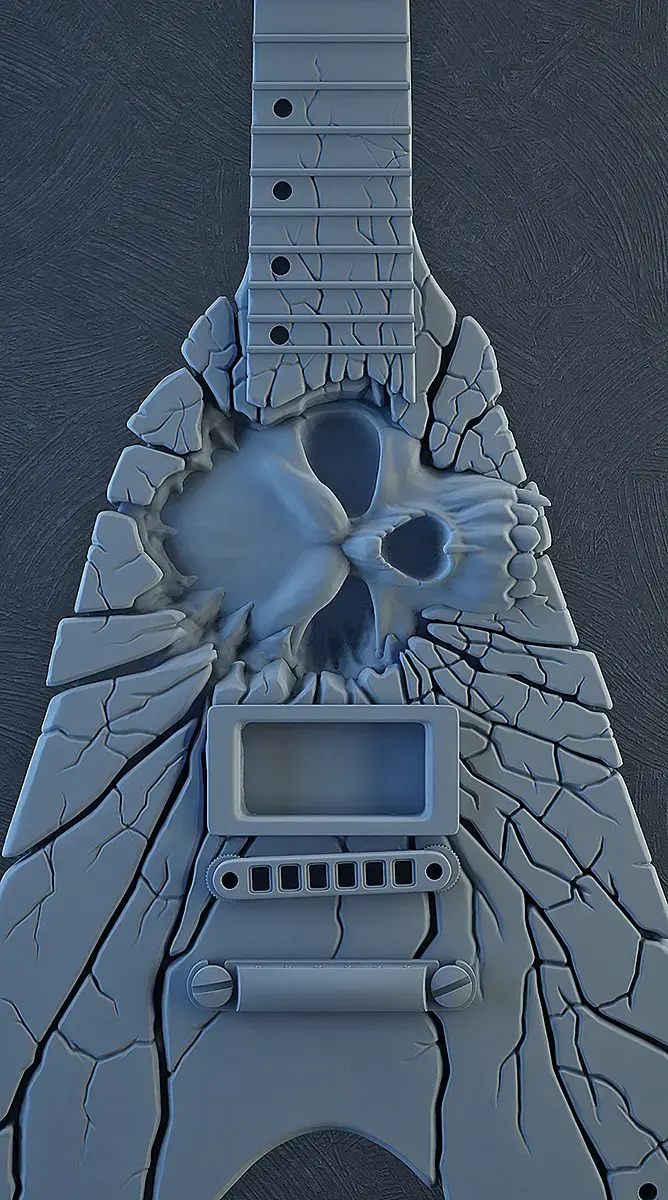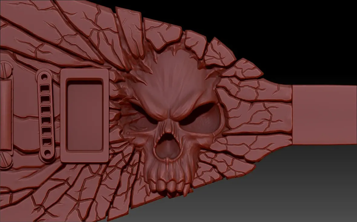 Всем привет! Изучаю потихоньку ZBrush, решил сразу делать модель и естественно по ходу скульптинга появляется много вопросов, ну а я пытаюсь на практике их решать )))Еще очень давно увидел в инете гитару ESP God of Death. Пытался ее в максе замоделить, но быстро понял, что макс для этого не предназначен и забросил идею на много лет. Ну а когда начал изучать ZBrush, вспомнил про гитару и решил на ней учиться ))Пока на данный момент выглядит гитара вот так: