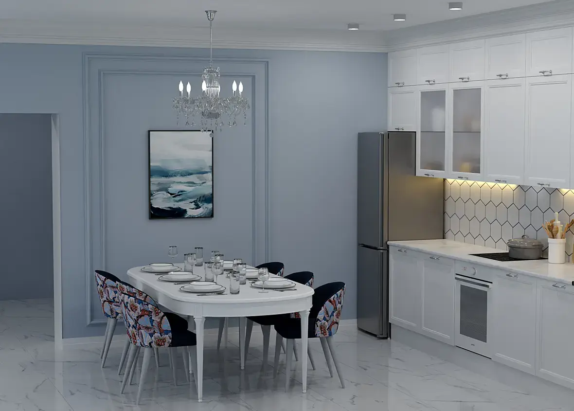 1. лучше убрать весь декор- рамки (может 1 картина, по центр оси будет эстетичнее смотреться) , чайник, кастрюлю (кажется что-то с масштабом у них). стоит проверить размеры реальной посуды. Лучше собрать все самое основное (в сермате) , выставить ракарс, свет, потом декор осторожно ставить под ракурс, а на финал оставить настройку материалов.