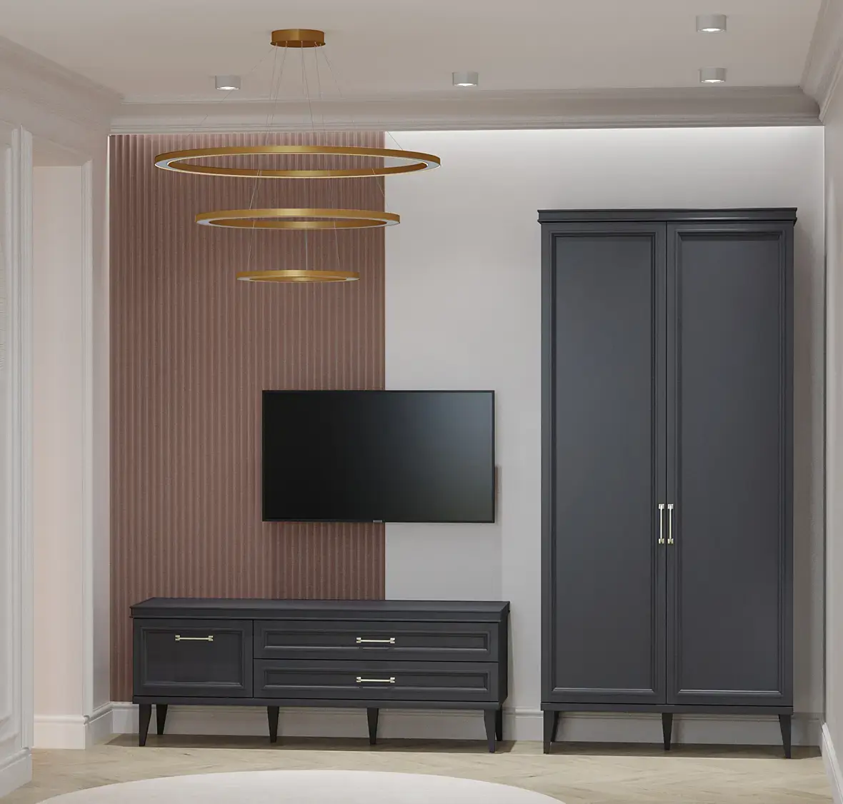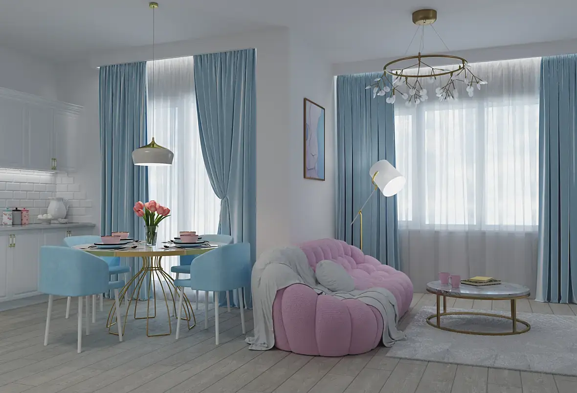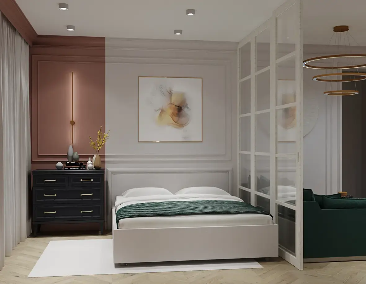 - композиция на стене чрезмерно навязчива... я устала от нее, пока разглядывала работу. Золотые рамки не сочетаются ни с чем на рендере.