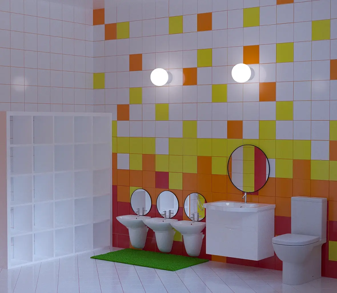 Помогите пожалуйста довести до более реалистичного вида...кроме мелочей в интерьере, что бы может изменили? Сан.узел в ясельной группе детского сада. От заказчика просьба: ярко и не менять планировку...
