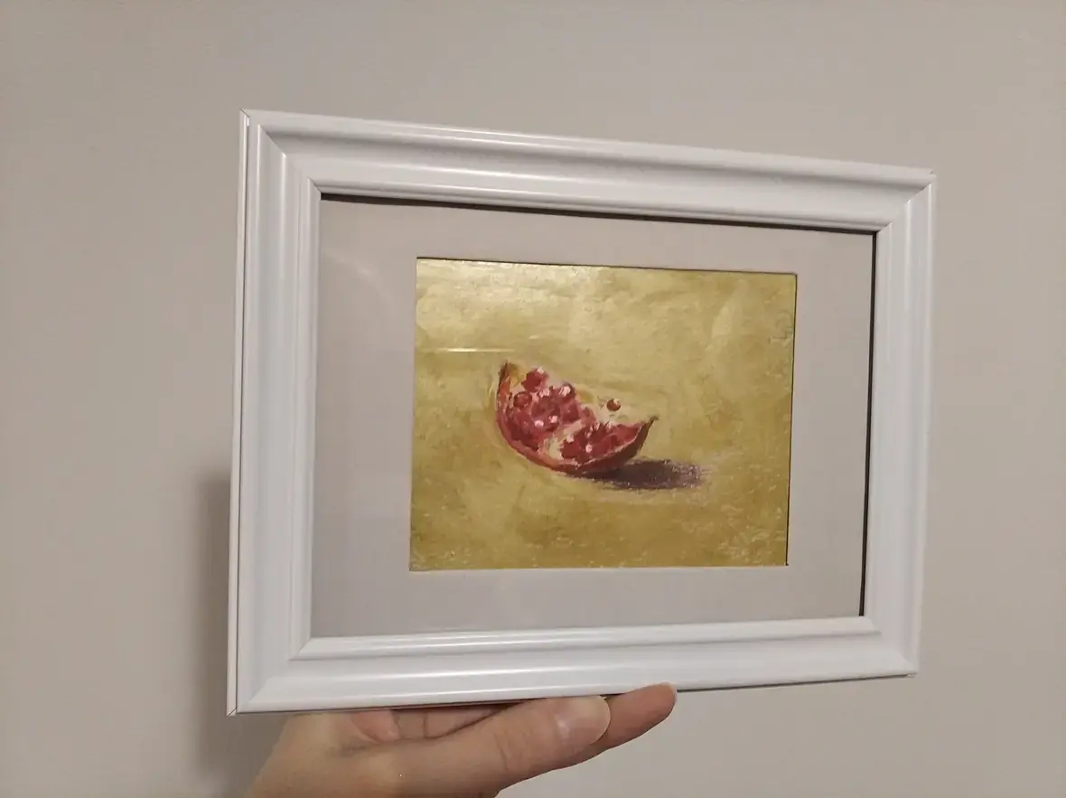 Первый гранатик нарисовала спонтанно, увидела картину с гранатами на золотом фоне и решила потестить свою золотую масляную пастель. В итоге и гранат нарисовался ) А второй недавний, тоже сама сделала зарисовку(пока, конечно, почти все с фото рисую)