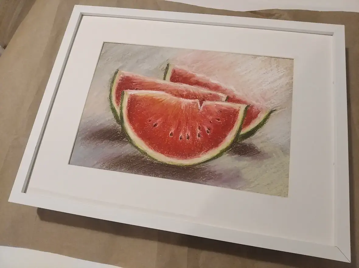 Арбузик по МК. Получился скучноватым, пока не могу добить экспрессии в сухой пастели, слишком он правильным вышел: