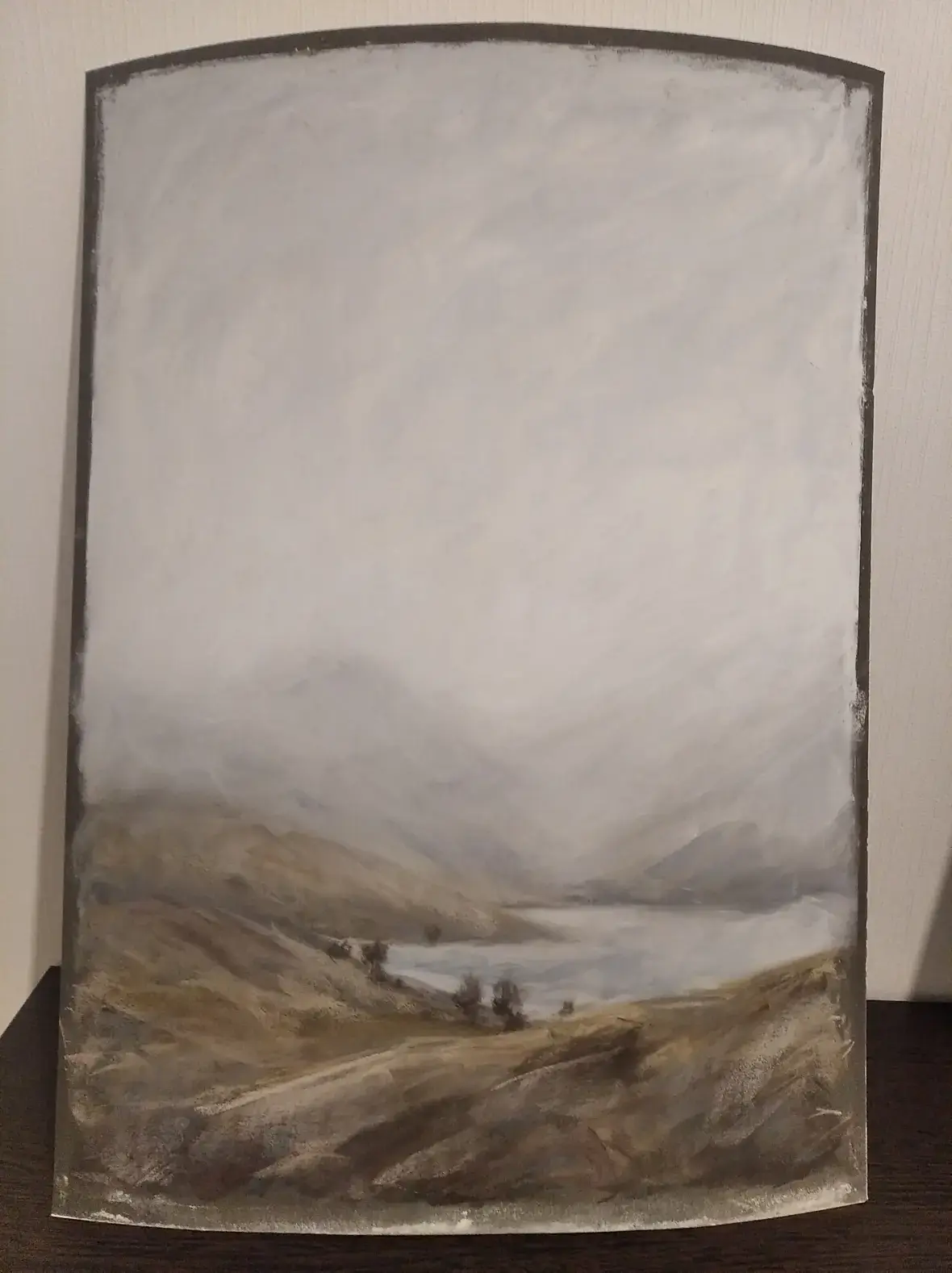 Это должно было быть дневным бежево-зеленым пейзажем со светлым небом, но что-то пошло не так, уехала в гамму предыдущего рисунка