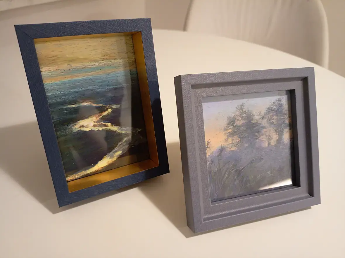 Купила рамки в запас, решила попробовать миниатюры масляной пастелью. Рефы даже искать особо не пришлось, под них как-то моментально нашлись сюжеты на Пинтересте. Первая рамка 10х14мм, вторая 12,5х12,5см