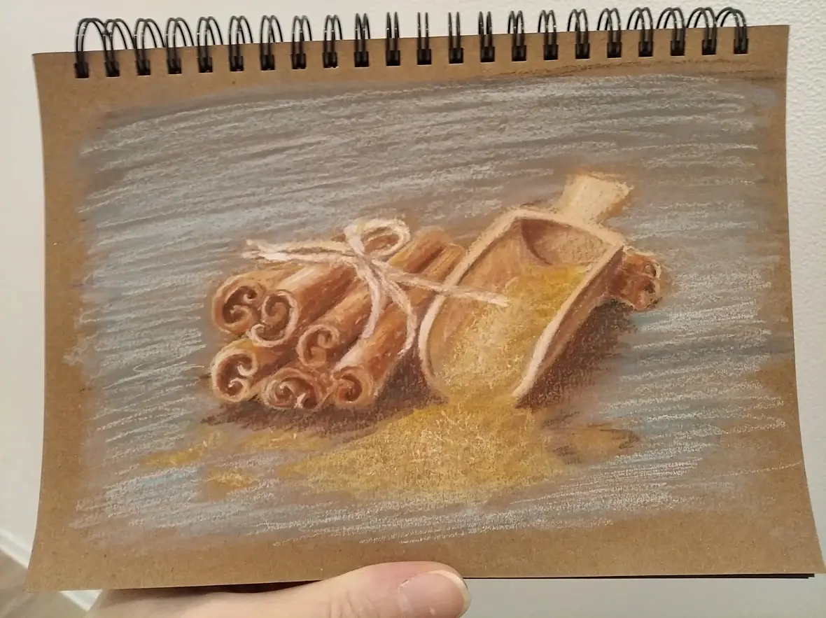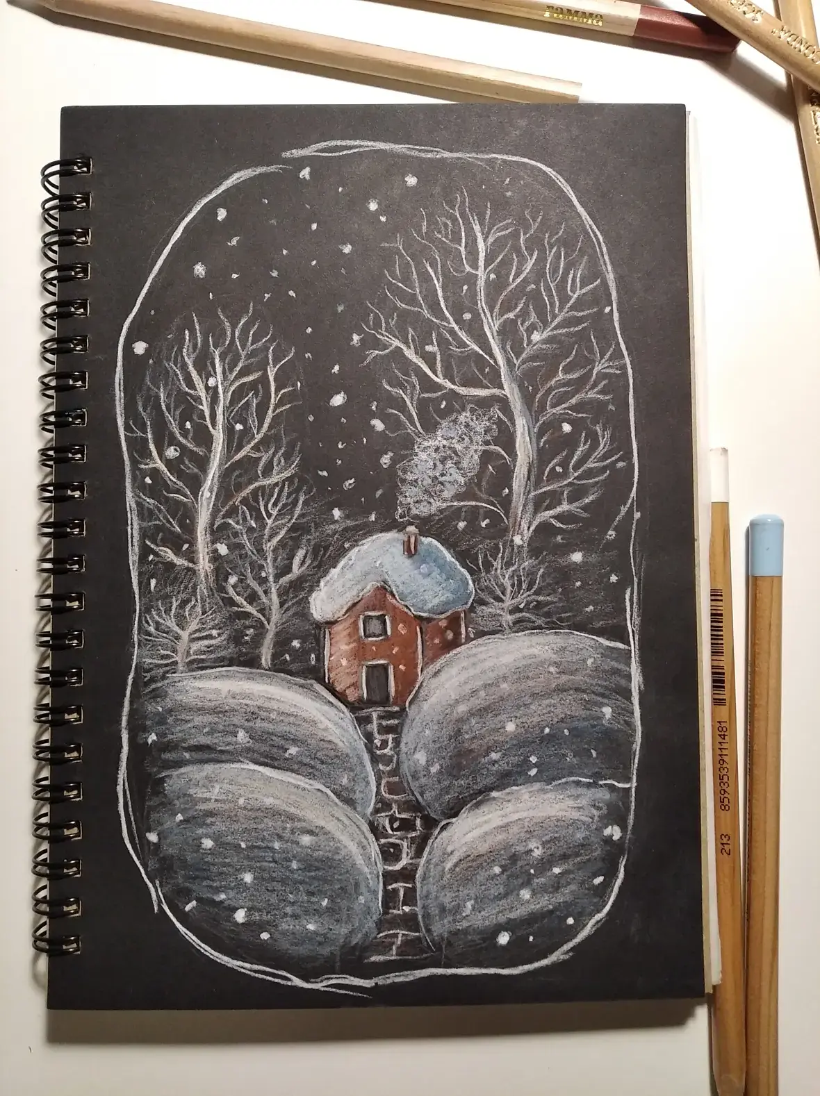 Ложку рисовала с натуры уже и черным и белым. А домик по МК. Потестила новый скетчбук, рисовала пастельными карандашами. Простенько, но миленько: