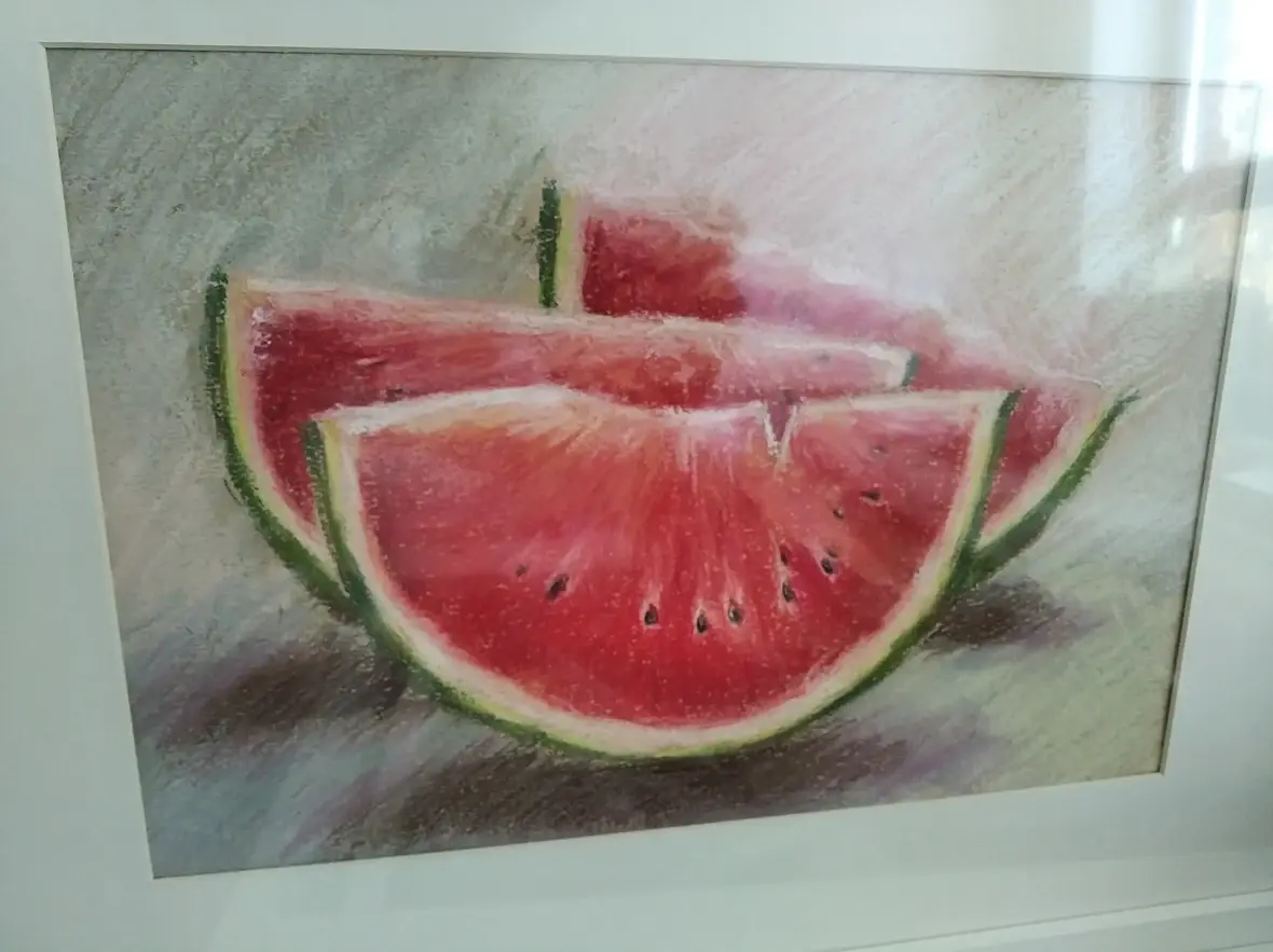 Арбузик по МК. Получился скучноватым, пока не могу добить экспрессии в сухой пастели, слишком он правильным вышел: