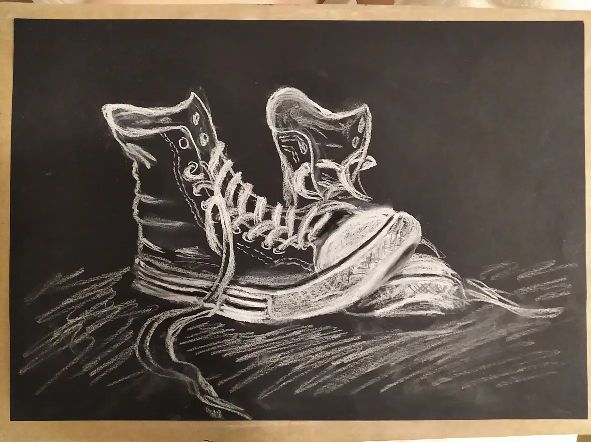 В чатике рисующих опубликовали одно из заданий, но белым на черном. Как тут устоишь. Мало того, что подуху нарисовала, так ещё и уже самостоятельно порисовала кеды. Пар пять или шесть вышло, не могла поймать пластику носа кеда. Но пришел муж и своим программистским оком осмотрел, ткнул пальцем где исправить и у меня получилось! :D