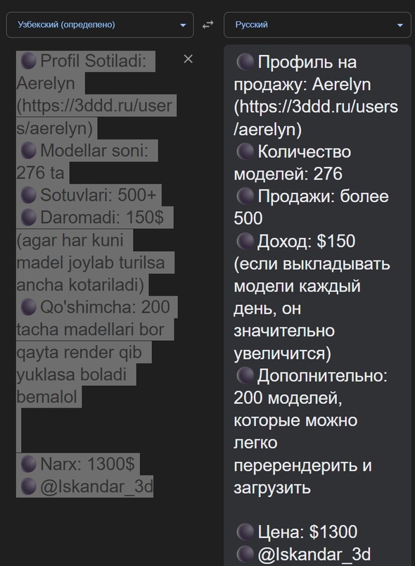 , где например видно как Искандар делает превью и упаковывает модель компьютерного стула, которую потом отправляет в телеграмме кому-то, и вот этот же стул на сайте - но не в аккаунте Искандара, конечно.