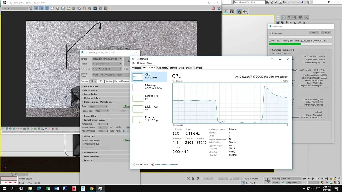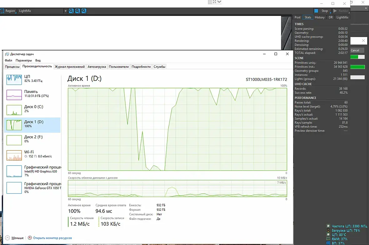Загрузка ЦП на 10 секунд в начале рендера 85-90 процентов, потому опять падает на проклятые 60%