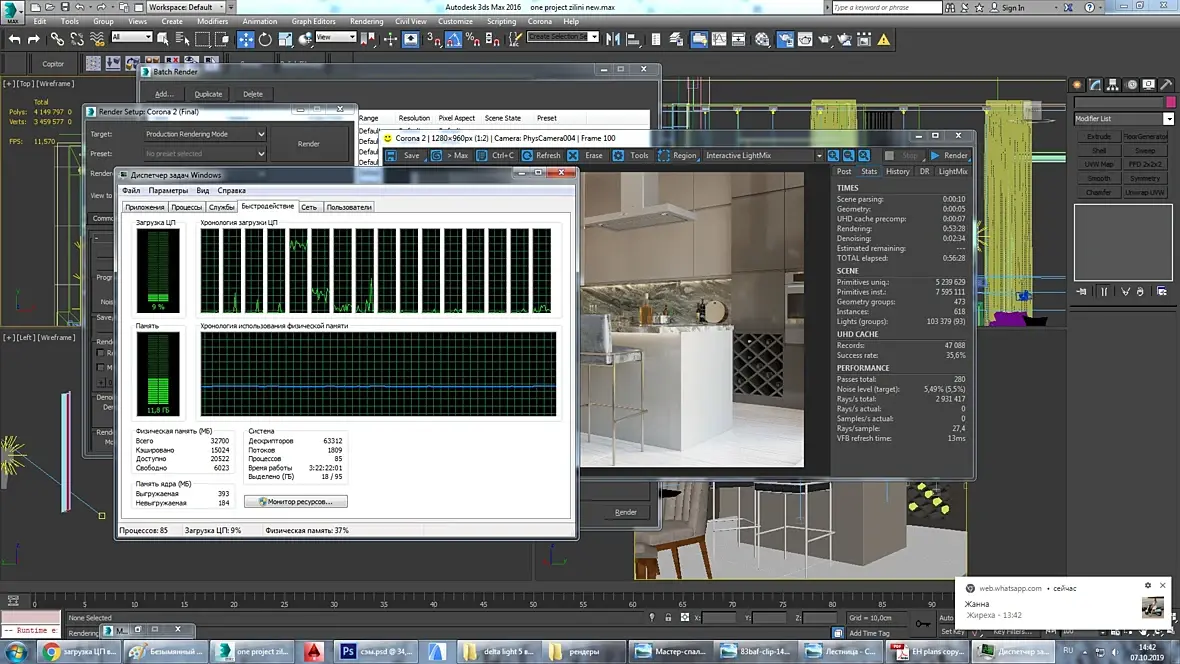 закрой 3дмакс, потом открой по новой и сразу сцену на рендер поставь. Возможно долго работал в интерактиве, макс с короной решили что память забивается и залезли в подкачку. Бывало такое.