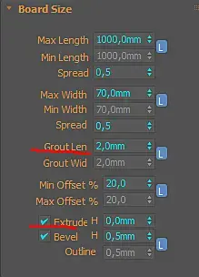 Если вам не важна процедурность в раскладке плитки, то могу предложить такой вариант: 1.FloorGenerator'ом создаете плитку, но с нулевыми швами и без фасок 2. Конвертите вашу плитку в Поли 3. Всем полигонам делаете инсерт на толщину шва (швам и плитке присваеваите разные id) 4. Экструдите полигоны плитки (при необходимости добавляете небольшой бевел для создания фаски).