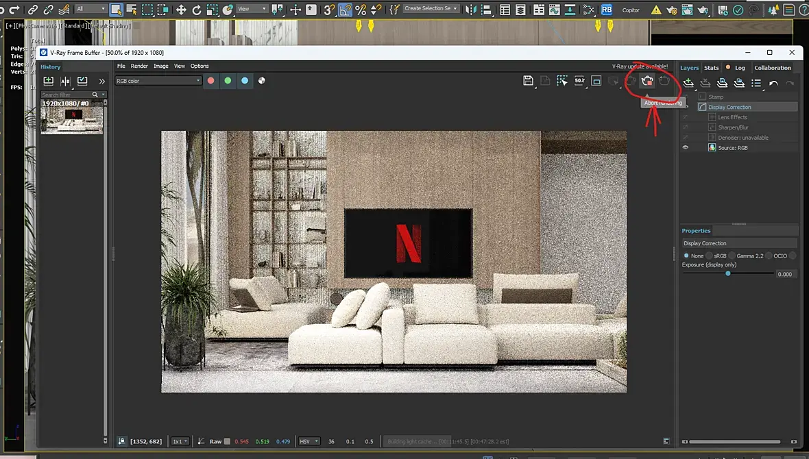 У меня была такая же ерунда, никак не реагировал на попытки остановить рендер. Но правда не зависал, а тупо считал до упора, не реагируя на кнопки стоп. Вылечилось только переустановкой вирея